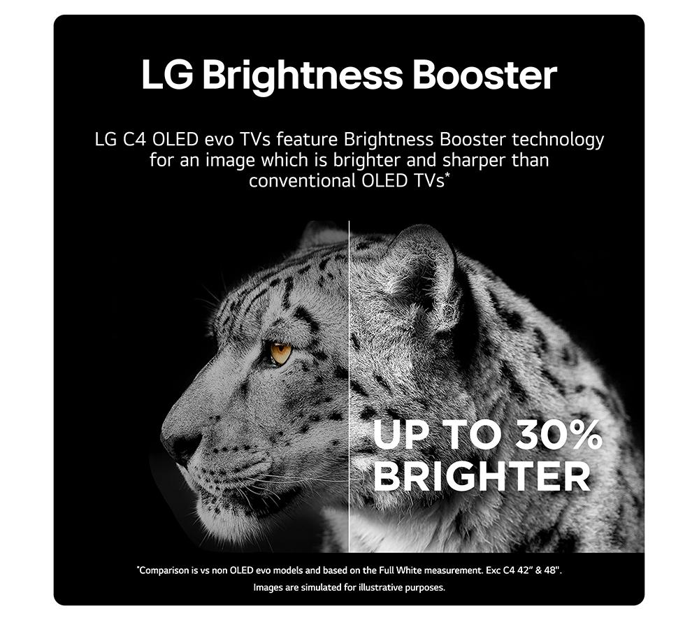 When was the last time your TV made you go ‘wow'? This LG C4 OLED TV uses self-lit pixels for perfect blacks and brilliant highlights – it's pretty magical. You'll be able to pick out every star in a night sky – and because there's no backlight, there's no annoying halos either. The a9 AI processor is the brain of the TV. It's hard at work in the background, upscaling the picture and audio of everything you watch. Even older entertainment is given a new lease of life with AI Super Upscaling. Speaking of entertainment, you'll be spoilt for choice. There's something for the whole family on webOS, LG's smart platform which includes Netflix, Disney+ and a whole lot more.Good to know- Filmmaker Mode turns off any picture processing that can make movies look unnatural, so it's closer to cinema-quality- Sound flows all around you with Dolby Atmos, making you feel like you're at the heart of the action- Dolby Vision HDR brings more depth to every scene with incredible contrast and vivid colours- Get the most out of your next-gen console with support for 4K@144 Hz and more gaming tech than you can shake a controller at- It looks great in any room thanks to its stunningly thin and light design- OLED Motion makes fast paced sports and movies look smooth, so it's easy to keep up with the action- AI Sound Pro transforms 2-channel audio into virtual 9.1.2 surround sound for that movie theatre experienceWhy we love it