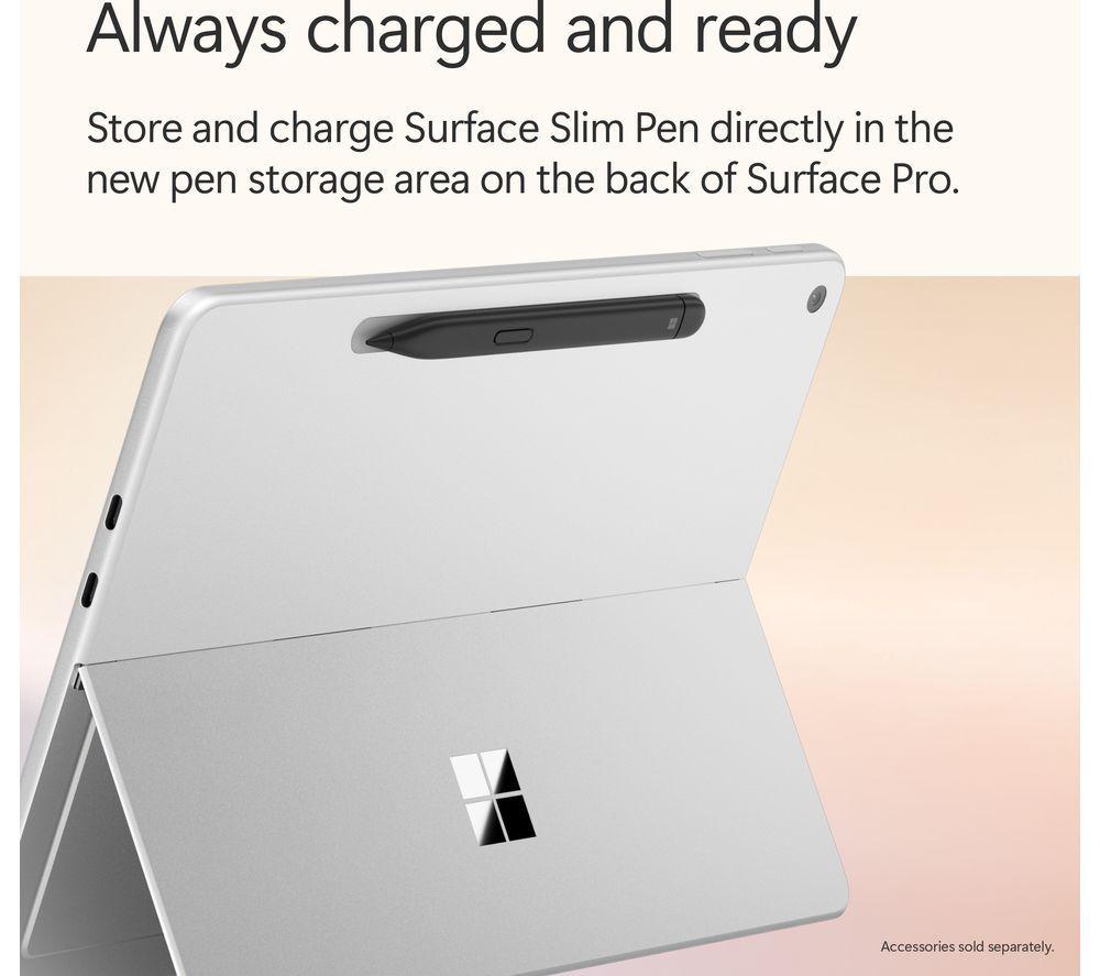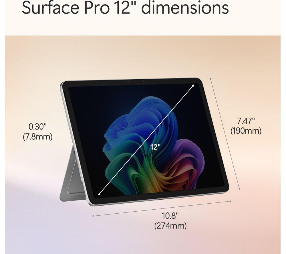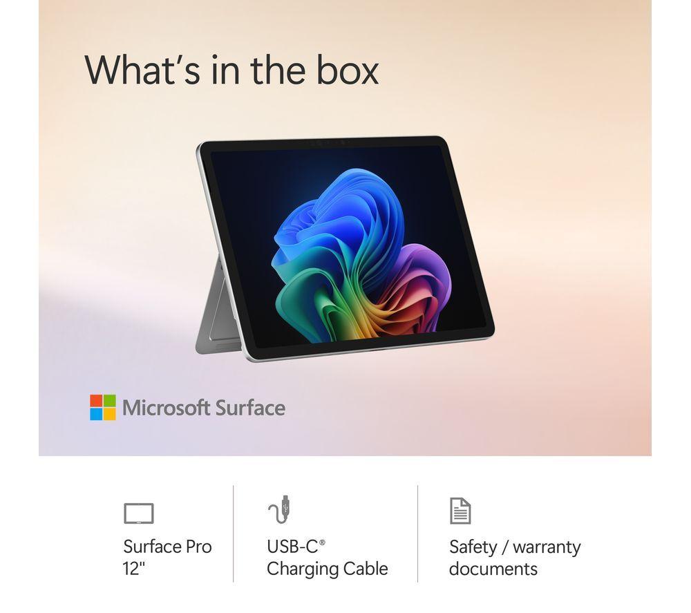 The Surface Pro squeezes the power of a laptop into a tablet, and adds AI features to make your life a little bit easier. It's built around the Snapdragon X Plus processor which is powerful, smart and efficient. That means you'll have up to 16 hours of battery life, so there's no rush to tick off those to-do boxes. The 2.1K PixelSense touchscreen's got plenty of detail and lifelike colours. Its 12” screen size makes it perfectly portable. And thanks to the built-in kickstand, you can set up shop anywhere. It only weighs 0.7 kg, so why leave it at home? Good to know - Cocreator can generate amazing images based on your text prompts - With Recall, you can search for documents, emails or web pages by just describing how you remember them - Look your best on video calls with Windows Studio Effects – it can improve lighting and blur your background - With Live Captions you'll never miss a word in the video you're watching - The Adreno integrated graphics gives the Surface extra power for editing photos and videos or playing games - Multitask your heart out – there's 16 GB of DDR5 RAM for smooth performance - Forget passwords! Just smile at the camera and Windows Hello will sign you in - Don't worry about connectors, the 2 USB Type-C ports can handle just about anything – from 4K monitors to super-fast SSDs - With WiFi 7, you'll have fast and steady internet connection – bye, bye loading circle! - There are 2 cameras – 4K on the back and 1080p on the front – both amazing for video calls ________________________________________________________________ Snapdragon is a product of Qualcomm Technologies, Inc. and/or its subsidiaries. Please note: Cocreator is optimised for English text prompts. Recall is coming soon through a post-launch Windows Update. Live captions currently support translation for video and audio subtitles into English from 40+ languages. For more information please visit the Microsoft website at aka.ms/copilotpluspcs. Recall (in preview) is coming soon through a post-launch Windows update. Timing will vary by device and region. Optimized for select languages (English, Chinese (simplified), French, German, Japanese, and Spanish). Content-based and storage limitations apply. See aka.ms/copilotpluspcs