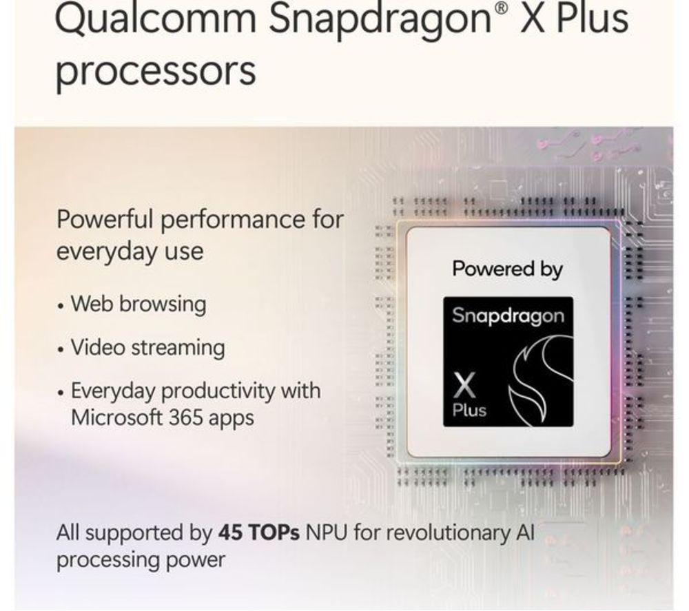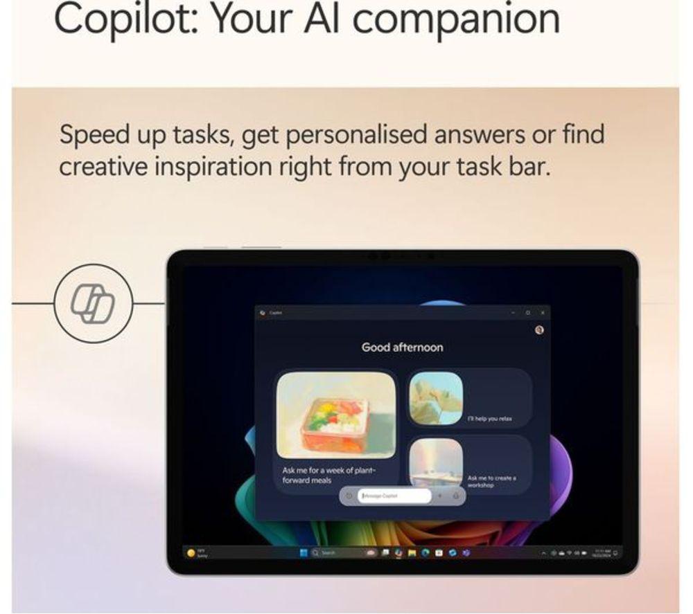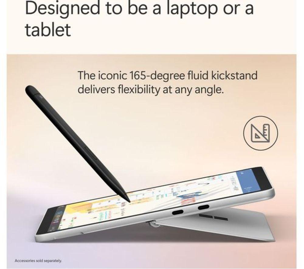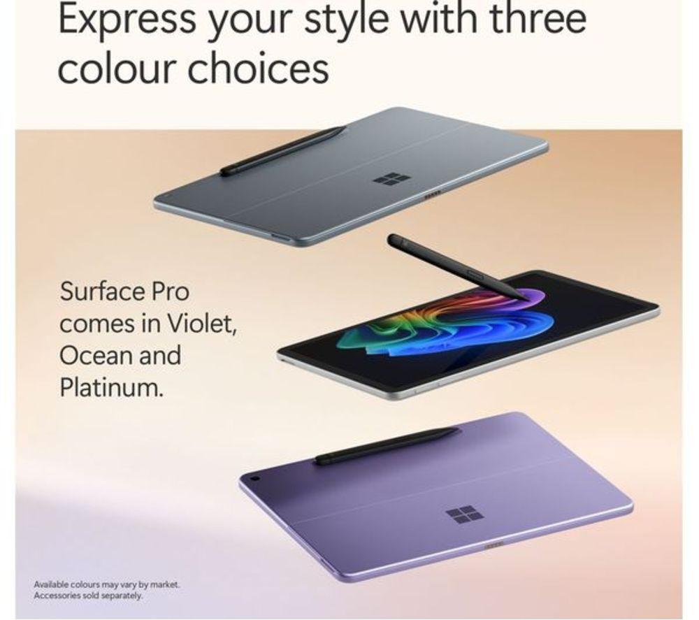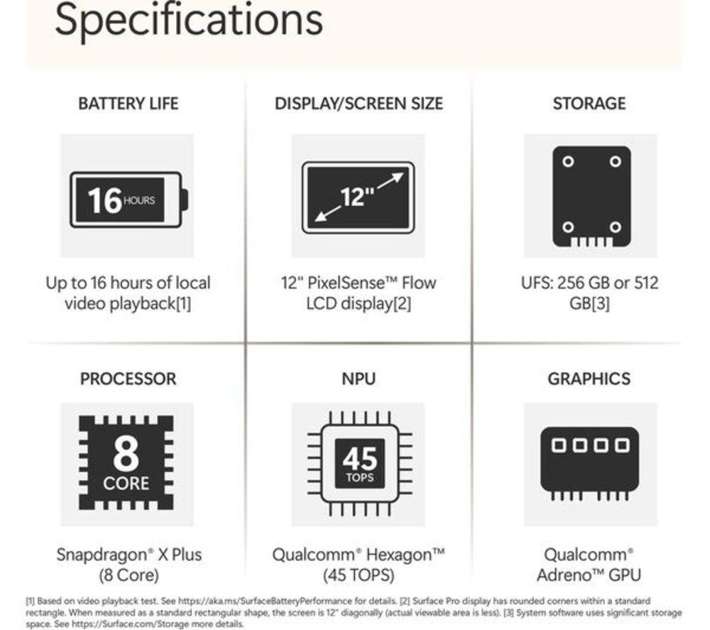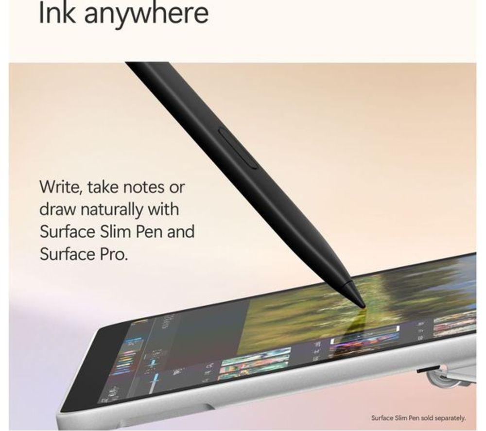 Product code: 676341 The Surface Pro squeezes the power of a laptop into a tablet, and adds AI features to make your life a little bit easier. It's built around the Snapdragon X Plus processor which is powerful, smart and efficient. That means you'll have up to 16 hours of battery life, so there's no rush to tick off those to-do boxes. The 2.1K PixelSense touchscreen's got plenty of detail and lifelike colours. Its 12” screen size makes it perfectly portable. And thanks to the built-in kickstand, you can set up shop anywhere. It only weighs 0.7 kg, so why leave it at home? Good to know - Cocreator can generate amazing images based on your text prompts - With Recall, you can search for documents, emails or web pages by just describing how you remember them - Look your best on video calls with Windows Studio Effects – it can improve lighting and blur your background - With Live Captions you'll never miss a word in the video you're watching   - The Adreno integrated graphics gives the Surface extra power for editing photos and videos or playing games - Multitask your heart out – there's 16 GB of DDR5 RAM for smooth performance - Forget passwords! Just smile at the camera and Windows Hello will sign you in - Don't worry about connectors, the 2 USB Type-C ports can handle just about anything – from 4K monitors to super-fast SSDs - With WiFi 7, you'll have fast and steady internet connection – bye, bye loading circle! - There are 2 cameras – 4K on the back and 1080p on the front – both amazing for video calls ________________________________________________________________ Snapdragon is a product of Qualcomm Technologies, Inc. and/or its subsidiaries. Please note: Cocreator is optimised for English text prompts. Recall is coming soon through a post-launch Windows Update. Live captions currently support translation for video and audio subtitles into English from 40+ languages. For more information please visit the Microsoft website at aka.ms/copilotpluspcs. Recall (in preview) is coming soon through a post-launch Windows update. Timing will vary by device and region. Optimized for select languages (English, Chinese (simplified), French, German, Japanese, and Spanish). Content-based and storage limitations apply. See aka.ms/copilotpluspcs var iframe = document.getElementById("surfaceIframefc879d"); window.addEventListener('message', (event) => { if (event.data != null && event.data.Action != undefined) { if (event.origin === 'https://v1.modern-life-interactive.com' && iframe.id == "surfaceIframefc879d") { var clientParams = { ElementIds: 'inline-surface-interactive-studio[ms]', ElementContext: "{\"src\":\"17-1111\"}", Action: event.data.Action, ActionContext: JSON.stringify(event.data.ActionContext) }; if (clientParams != null) { ccs_cc_log.dispatchEvent({"logFunctionName":"ccs_cc_loge_268435","paramsFunctionName":"ccs_cc_gete_params_268435","eventId":"043c1460"}, clientParams); } } } }); All-day energyDesigned by Microsoft, Surface Pro is an all-new Copilot+ PC, offering the ultimate versatility, portability, and performance with built-in AI experience. Up to 16 hours of battery life for all-day productivity while on the go. 12" PixelSense™ touchscreen offers an immersive viewing experience. Powered by Snapdragon® X Plus (8 Core) processors for ultra-fast performance. Supercharge your productivity with 45 trillion operations per second. The most flexible Copilot+ PC in its classSurface Pro offers versatility, all in a lightweight, compact size – so you can check off your tasks from anywhere. Ultra-flexible designIconic 165-degree fluid kickstand delivers flexibility at any angle. Brilliant 12" PixelSense touchscreenEnhanced performance for streaming, Surface Pro is built to be an incredible device for your favourite movies, shows, and music. The ports you needCharge on-the-go, transfer data fast, or create the ultimate desktop set up with two USB-C® 3.2 ports. Choose from three stunning colorsExpress your style with your choice of three colours – Violet, Ocean and Platinum. Productivity and efficiency, redefinedBuilt with the latest Qualcomm Snapdragon X Plus (8 Core) processors, Surface Pro delivers impressive performance and features a NPU with up to 45 TOPS designed to accelerate AI experiences. Snapdragon X Plus (8 Core) processors Powerful performance for everyday useWeb browsingVideo streamingEveryday productivity with Microsoft 365 appsQualcomm® Hexagon™ NPU with 45 TOPSWith the ability to process 45 trillion operations per second, the turbocharged NPU lets you access built-in AI experience to enhance your productivity and creativity. Unlock your new superpowerElevate your productivity and creativity with exclusive Copilot+ PC experiences. Laptop productivity and tablet creativity on the goThis versatile device gives you laptop grade power and tablet creativity, providing incredible value without the need for multiple devices. A traditional tabletNo keyboard is required – Easily navigate your favourite apps with just touch in both portrait and landscape mode. A traditional laptopSurface Pro 12-inch Keyboard[2,3] turns Surface Pro into a full thin and light Windows laptop with a comfortable typing and touchpad experience. A canvas for inkingSketch a picture or write down notes with Surface Slim Pen[3] in Studio mode Build your perfect setupPair your Surface Pro with a range of accessories[3] to create a personalised setup that meets your needs. Surface Pro 12-inch KeyboardFlex your way through work and play – A full-sized backlit keyboard, precision touchpad and dedicated Copilot key to enhance your experience. Surface Slim PenUnleash your creative and productive potential – Dream up your latest idea or take notes naturally with a carpenter-style design and haptic feedback. Surface 45W USB-C Wall ChargerPower your day wherever you go – Sleek and compact design is ready to charge your Surface Pro with 45W of power via USB-C®. Mi