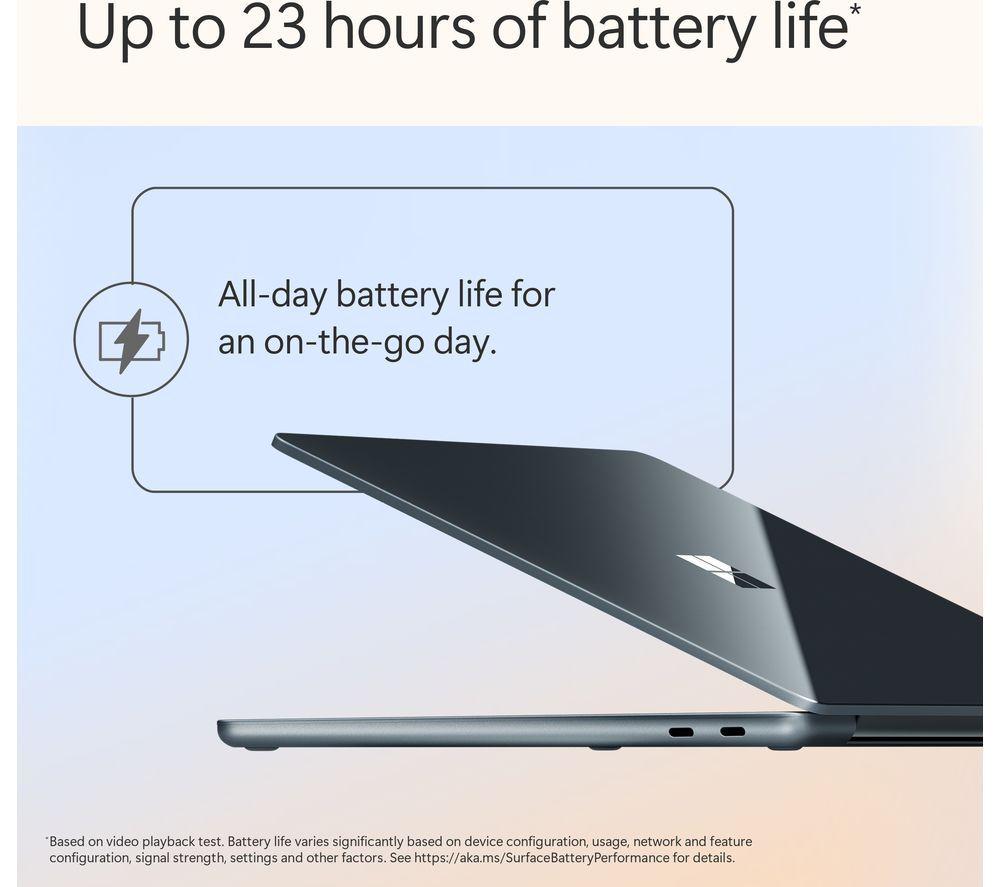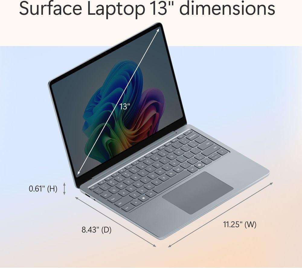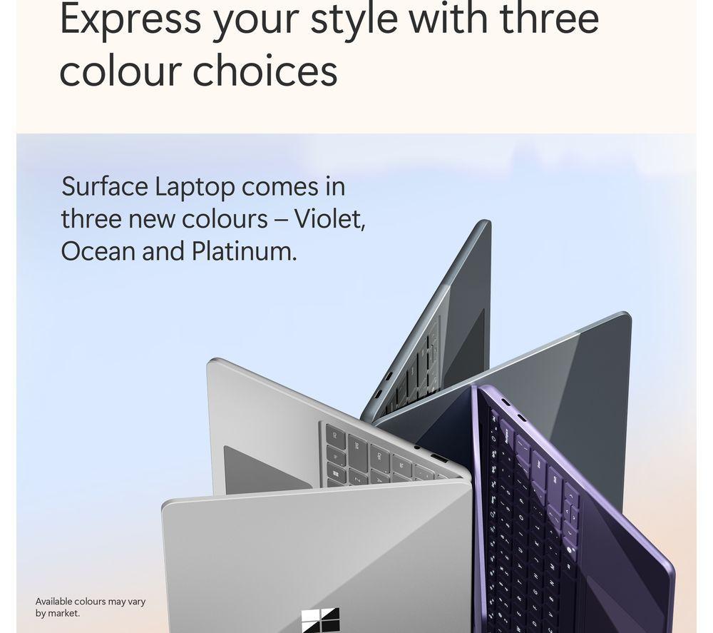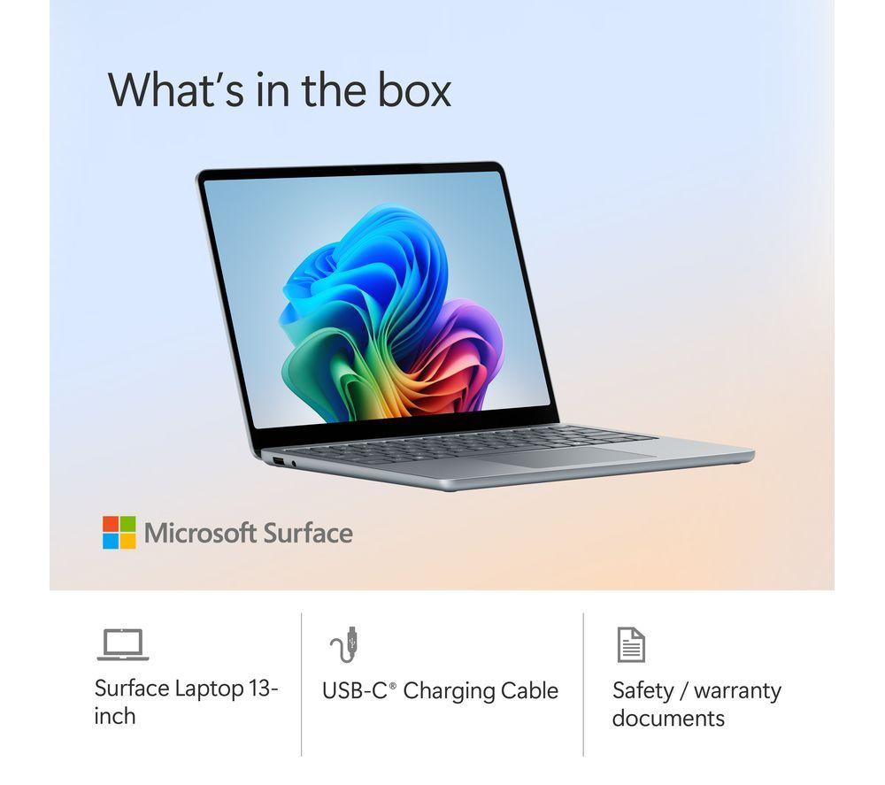 Product code: 795920 The Surface Laptop is loaded with clever AI features that'll help you get things done faster. The powerful and efficient Snapdragon X Plus processor will breeze through your work or class assignments. Then you can kick back with a movie on the 13" Full HD+ touchscreen. It's wrapped in a beautiful aluminium body, which makes the laptop durable and lightweight. The perfect combo for staying productive on the go. Plus, with up 23 hours of battery life, you don't even need to worry about bringing a charger. Good to know - A Copilot+ PC brings the latest AI features so you can work and create faster than ever before - Cocreator can generate amazing images based on your text prompts - With Recall, you can search for documents, emails or web pages by just describing how you remember them - Look your best on video calls with Windows Studio Effects – it can improve lighting and blur your background - With Live Captions you'll never miss a word in the video you're watching - The dedicated Copilot key is your shortcut to all Copilot AI features - The Adreno integrated graphics gives the Surface extra power for editing photos and videos or playing games - Multitask your heart out – there's 16 GB of DDR5 RAM for smooth performance - Forget passwords! With the Windows Hello fingerprint reader you just need to tap your finger - Don't worry about connectors, the 2 USB Type-c ports can handle just about anything – from 4K monitors to super-fast SSDs - With WiFi 7, you'll have fast and steady internet connection – bye, bye loading circle! ________________________________________________________________ Snapdragon is a product of Qualcomm Technologies, Inc. and/or its subsidiaries. Please note: Cocreator is optimised for English text prompts. Recall is coming soon through a post-launch Windows Update. Live captions currently support translation for video and audio subtitles into English from 40+ languages. For more information please visit the Microsoft website at aka.ms/copilotpluspcs. var iframe = document.getElementById("surfaceIframe9dcc44"); window.addEventListener('message', (event) => { if (event.data != null && event.data.Action != undefined) { if (event.origin === 'https://v1.modern-life-interactive.com' && iframe.id == "surfaceIframe9dcc44") { var clientParams = { ElementIds: 'inline-surface-interactive-studio[ms]', ElementContext: "{\"src\":\"17-1110\"}", Action: event.data.Action, ActionContext: JSON.stringify(event.data.ActionContext) }; if (clientParams != null) { ccs_cc_log.dispatchEvent({"logFunctionName":"ccs_cc_loge_a5da22","paramsFunctionName":"ccs_cc_gete_params_a5da22","eventId":"59fea73e"}, clientParams); } } } }); Ultralight, packed with performanceDesigned by Microsoft, Surface Laptop is an all-new Copilot+ PC, and the most portable Surface Laptop. Up to 23 hours of battery life[1] for all-day productivity while on the go. 13" PixelSense™ touchscreen offers an immersive viewing experience. Powered by Snapdragon® X Plus (8 Core) processors for ultra-fast performance. Supercharge your productivity with 45 trillion operations per second. The most portable Copilot+ PC Surface LaptopUltraportable and lightweight, Surface Laptop was crafted to move with you, no matter where the day takes you. Brilliant 13" PixelSense touchscreenSurface Laptop is built to be an incredible device for streaming your favourite movies, shows, and music. Ultraportable and lightweightLightweight at 2.7 pounds and compact, Surface Laptop is built to go anywhere. Type with perfectionAccurate, fast and comfortable with large precision touchpad for better productivity. The ports you needCharge on-the-go, transfer data fast, or create the ultimate desktop set up with two USB-C® 3.2 ports.[3] Productivity and efficiency, redefinedBuilt with the latest Qualcomm Snapdragon X Plus (8 Core) processors, Surface Laptop delivers impressive performance and features a NPU with up to 45 TOPS designed to accelerate AI experiences. Snapdragon X Plus (8 Core) processorsPowerful performance for everyday useWeb browsingVideo streamingEveryday productivity with Microsoft 365 appsQualcomm® Hexagon™ NPU with 45 TOPSWith the ability to process 45 trillion operations per second, the turbocharged NPU lets you access built-in AI experience to enhance your productivity and creativity. Unlock your new superpowerElevate your productivity and creativity with exclusive Copilot+ PC experiences.[4] Find your perfect matchExpress your style in your choice of three colours – Violet, Platinum and Ocean.[2] Build your perfect setupPair your Surface Laptop with a range of accessories[11] to create a personalised setup that meets your needs. Power Your Day with Surface 45W USB-C Wall ChargerDesigned to charge your Surface Laptop with 45W of power via USB-C®. Your perfect travel companionSlim, light, and ready to travel, Surface Arc Mouse is designed to conform to your hand. Optimise your workspace with Surface USB4-DockAn affordable and efficient USB4®[3] docking solution for productivity and connectivity. Microsoft 365 for SurfaceUnlock new capabilities, build your skills, and uncover worlds of possibility with new AI-powered features with Microsoft 365.[12] *Screen simulated[1]Battery life varies significantly based on usage, network and feature configuration, signal strength, settings and other factors. See https://aka.ms/SurfaceBatteryPerformance for details.[2]Available colours may vary by market.[3]USB4® and USB-C® are registered trademarks of USB Implementers Forum.[4]On some devices, Copilot+ PC experiences require free updates available starting later this year and continuing into 2025. Timing varies by device and region – aka.ms/copilotpluspcs.[5]May require Windows Update or app download from the Microsoft Store.[6]Available on Copilot+ PCs with Snapdragon® X Series processors starting early 2025 and on other devices starting mid-2025. Text actions available across marke