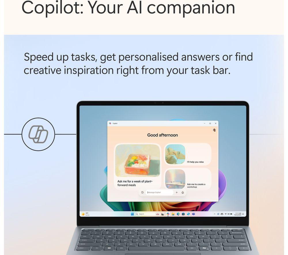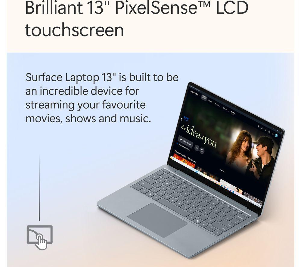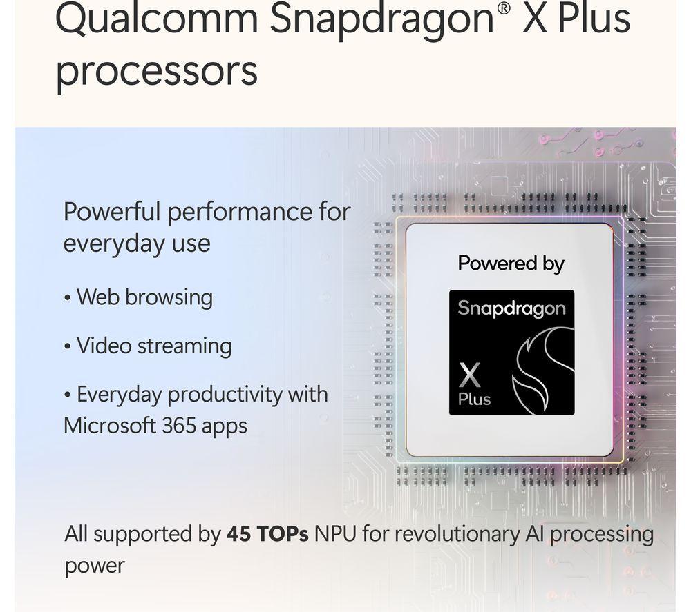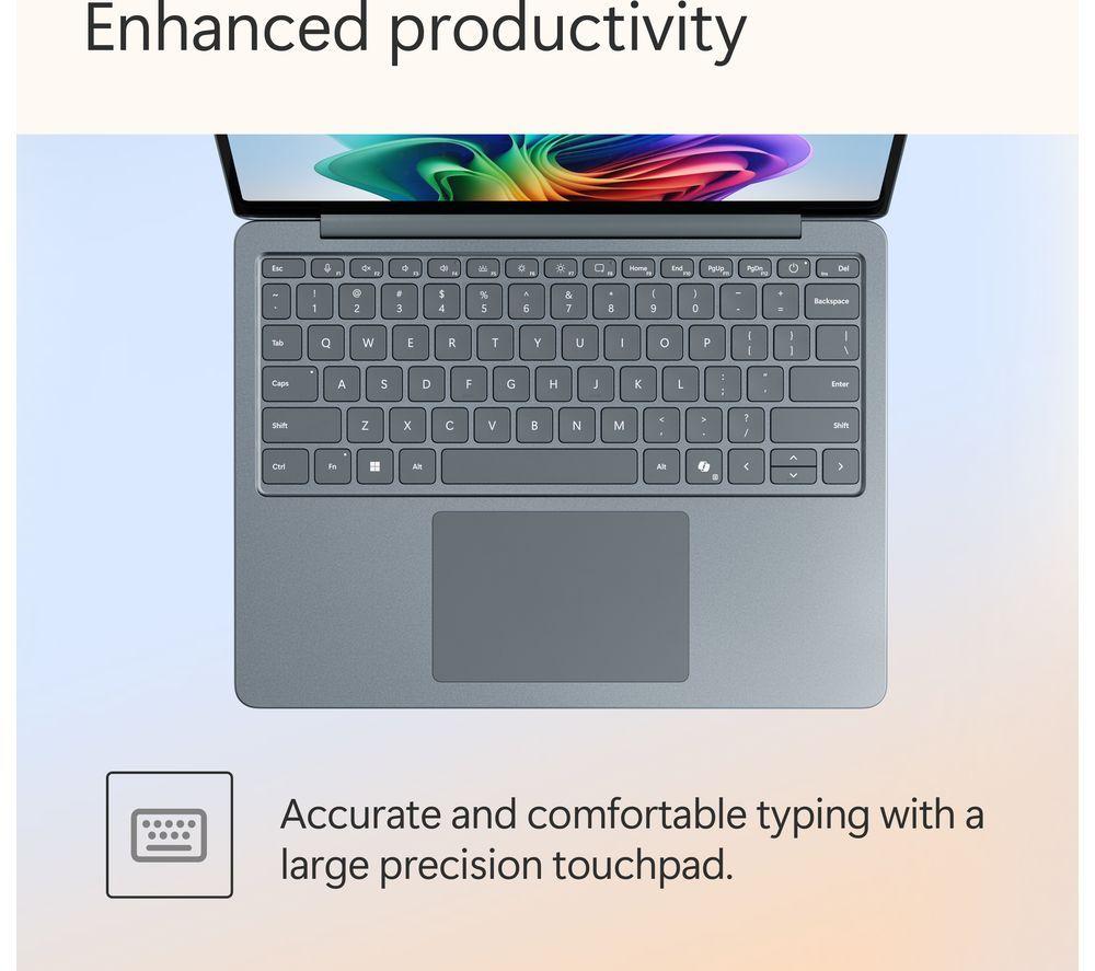 Product code: 795920 The Surface Laptop is loaded with clever AI features that'll help you get things done faster. The powerful and efficient Snapdragon X Plus processor will breeze through your work or class assignments. Then you can kick back with a movie on the 13" Full HD+ touchscreen. It's wrapped in a beautiful aluminium body, which makes the laptop durable and lightweight. The perfect combo for staying productive on the go. Plus, with up 23 hours of battery life, you don't even need to worry about bringing a charger. Good to know - A Copilot+ PC brings the latest AI features so you can work and create faster than ever before - Cocreator can generate amazing images based on your text prompts - With Recall, you can search for documents, emails or web pages by just describing how you remember them - Look your best on video calls with Windows Studio Effects – it can improve lighting and blur your background - With Live Captions you'll never miss a word in the video you're watching - The dedicated Copilot key is your shortcut to all Copilot AI features - The Adreno integrated graphics gives the Surface extra power for editing photos and videos or playing games - Multitask your heart out – there's 16 GB of DDR5 RAM for smooth performance - Forget passwords! With the Windows Hello fingerprint reader you just need to tap your finger - Don't worry about connectors, the 2 USB Type-c ports can handle just about anything – from 4K monitors to super-fast SSDs - With WiFi 7, you'll have fast and steady internet connection – bye, bye loading circle! ________________________________________________________________ Snapdragon is a product of Qualcomm Technologies, Inc. and/or its subsidiaries. Please note: Cocreator is optimised for English text prompts. Recall is coming soon through a post-launch Windows Update. Live captions currently support translation for video and audio subtitles into English from 40+ languages. For more information please visit the Microsoft website at aka.ms/copilotpluspcs. var iframe = document.getElementById("surfaceIframe9dcc44"); window.addEventListener('message', (event) => { if (event.data != null && event.data.Action != undefined) { if (event.origin === 'https://v1.modern-life-interactive.com' && iframe.id == "surfaceIframe9dcc44") { var clientParams = { ElementIds: 'inline-surface-interactive-studio[ms]', ElementContext: "{\"src\":\"17-1110\"}", Action: event.data.Action, ActionContext: JSON.stringify(event.data.ActionContext) }; if (clientParams != null) { ccs_cc_log.dispatchEvent({"logFunctionName":"ccs_cc_loge_a5da22","paramsFunctionName":"ccs_cc_gete_params_a5da22","eventId":"59fea73e"}, clientParams); } } } }); Ultralight, packed with performanceDesigned by Microsoft, Surface Laptop is an all-new Copilot+ PC, and the most portable Surface Laptop. Up to 23 hours of battery life[1] for all-day productivity while on the go. 13" PixelSense™ touchscreen offers an immersive viewing experience. Powered by Snapdragon® X Plus (8 Core) processors for ultra-fast performance. Supercharge your productivity with 45 trillion operations per second. The most portable Copilot+ PC Surface LaptopUltraportable and lightweight, Surface Laptop was crafted to move with you, no matter where the day takes you. Brilliant 13" PixelSense touchscreenSurface Laptop is built to be an incredible device for streaming your favourite movies, shows, and music. Ultraportable and lightweightLightweight at 2.7 pounds and compact, Surface Laptop is built to go anywhere. Type with perfectionAccurate, fast and comfortable with large precision touchpad for better productivity. The ports you needCharge on-the-go, transfer data fast, or create the ultimate desktop set up with two USB-C® 3.2 ports.[3] Productivity and efficiency, redefinedBuilt with the latest Qualcomm Snapdragon X Plus (8 Core) processors, Surface Laptop delivers impressive performance and features a NPU with up to 45 TOPS designed to accelerate AI experiences. Snapdragon X Plus (8 Core) processorsPowerful performance for everyday useWeb browsingVideo streamingEveryday productivity with Microsoft 365 appsQualcomm® Hexagon™ NPU with 45 TOPSWith the ability to process 45 trillion operations per second, the turbocharged NPU lets you access built-in AI experience to enhance your productivity and creativity. Unlock your new superpowerElevate your productivity and creativity with exclusive Copilot+ PC experiences.[4] Find your perfect matchExpress your style in your choice of three colours – Violet, Platinum and Ocean.[2] Build your perfect setupPair your Surface Laptop with a range of accessories[11] to create a personalised setup that meets your needs. Power Your Day with Surface 45W USB-C Wall ChargerDesigned to charge your Surface Laptop with 45W of power via USB-C®. Your perfect travel companionSlim, light, and ready to travel, Surface Arc Mouse is designed to conform to your hand. Optimise your workspace with Surface USB4-DockAn affordable and efficient USB4®[3] docking solution for productivity and connectivity. Microsoft 365 for SurfaceUnlock new capabilities, build your skills, and uncover worlds of possibility with new AI-powered features with Microsoft 365.[12] *Screen simulated[1]Battery life varies significantly based on usage, network and feature configuration, signal strength, settings and other factors. See https://aka.ms/SurfaceBatteryPerformance for details.[2]Available colours may vary by market.[3]USB4® and USB-C® are registered trademarks of USB Implementers Forum.[4]On some devices, Copilot+ PC experiences require free updates available starting later this year and continuing into 2025. Timing varies by device and region – aka.ms/copilotpluspcs.[5]May require Windows Update or app download from the Microsoft Store.[6]Available on Copilot+ PCs with Snapdragon® X Series processors starting early 2025 and on other devices starting mid-2025. Text actions available across marke