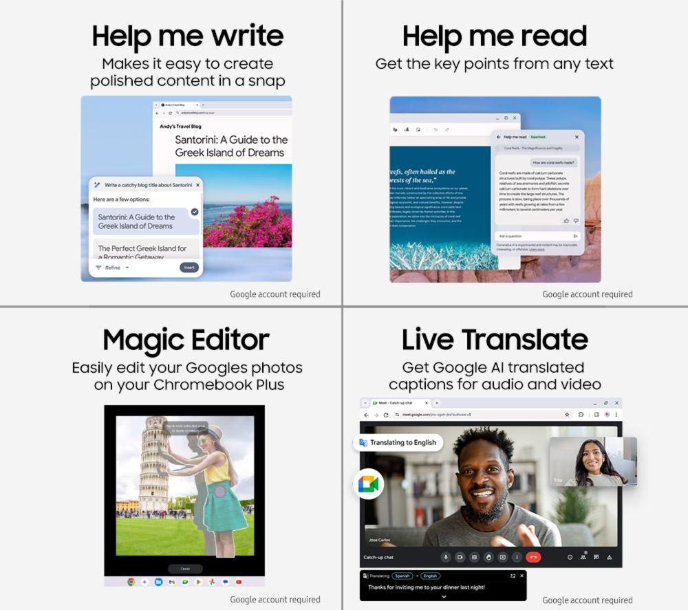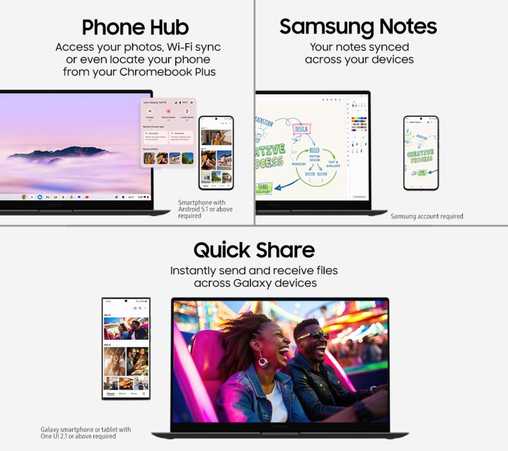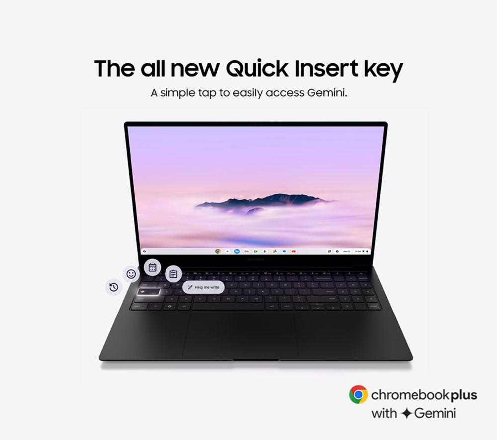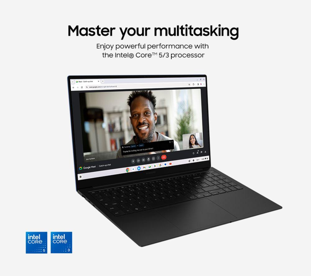 The Galaxy Chromebook Plus can keep you productive and entertained anywhere. Hiding inside is the Intel® Core™ 3 processor supported by Intel® Graphics. Together they make quick work of all your apps and tasks. And Google's Gemini AI is always ready to help you write, create or research. The 15.6" AMOLED screen's got incredibly vivid colours – just what you want for movie nights. Good to know - The Galaxy Chromebook only weighs 1.1 kg, so you'll barely know it's in your bag - With WiFi 6E you'll have a fast and steady internet connection - The Quick Insert Key brings up all your most used features, like the search bar or AI apps - It's got a Full HD webcam, ready to connect you with your friends, family or colleagues - With up to 13 hours of battery life, you don't need to worry about bringing a charger to work - There's all the ports you might need, including USB, HDMI and USB Type-C – no dongles necessary - With 256 GB of UFS storage, you have plenty of space for your apps, photos and music __________________________________________________________________________ Intel, the Intel logo, Celeron, Intel Atom, Intel Core, Intel. Experience What's Inside, Intel Inside, the Intel Inside logo, Intel Unite, Iris, Pentium, Thunderbolt, the Thunderbolt logo, and Ultrabook are trademarks of Intel Corporation in the U.S. and/or other countries.