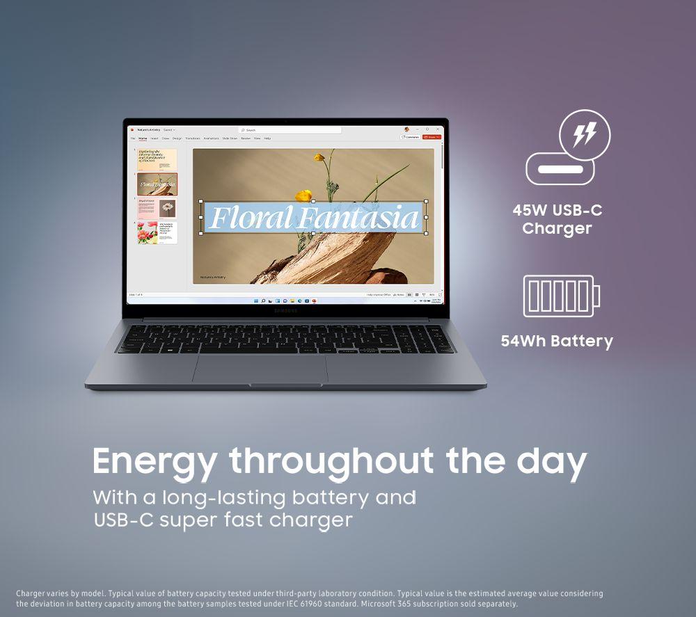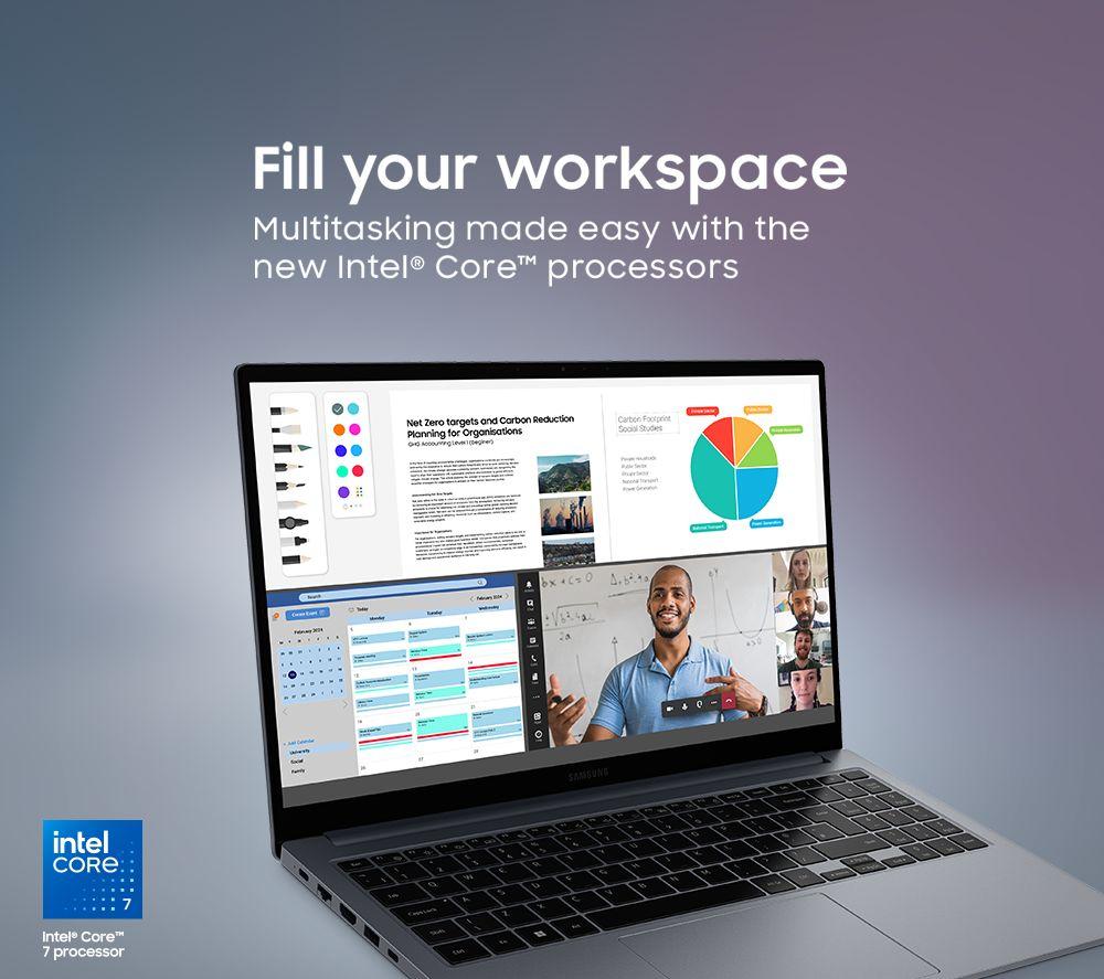 The Galaxy Book4 (2024) might be super-thin, but it packs all the power you need to work, play and create. Hiding inside is the new Intel® Core™ 7 processor supported by Intel® Graphics. Together they make quick work of all your apps and tasks. The 15.6" Full HD screen is big, sharp and bright enough, so you can work comfortably wherever you are. And with the massive 54 Wh battery, you can head out without worrying about the charger. Good to know - The Galaxy Book4 only weighs 1.57 kg, so you'll barely know it's in your bag - With WiFi 6 you'll have a fast and steady internet connection - Thanks to the stereo speakers with Dolby Atmos support you'll hear every whisper in your favourite show - There's all the ports you might need, including HDMI, USB Type-C and Ethernet – no dongles necessary - With 512 GB of SSD, you have plenty of space for your apps, photos and music __________________________________________________________________________ Intel, the Intel logo, Celeron, Intel Atom, Intel Core, Intel. Experience What's Inside, Intel Inside, the Intel Inside logo, Intel Unite, Iris, Pentium, Thunderbolt, the Thunderbolt logo, and Ultrabook are trademarks of Intel Corporation in the U.S. and/or other countries.