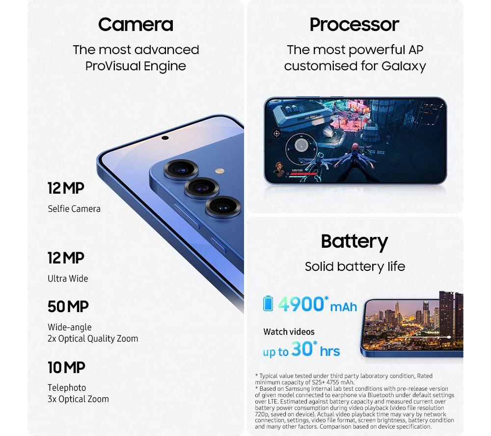 With the Galaxy S25+ in your pocket, you'll never be left scratching your head. Whether you're trying to find a new recipe or see when your favourite band is in town, Galaxy AI is your 24/7 assistant. Just tell it what you want to know and it'll scour multiple apps to find what you're looking for. From browsing to binging and everything in between, the 6.7" Quad HD+ dynamic AMOLED display is a treat to look at. The camera is pretty special too. The 50 MP sensor and Nitography AI will make sure every snap is a masterpiece, even in low light. You can even remove any annoying photobombers with Photo Assist. One tap and they're outta there! The brain behind the operation is the new Snapdragon 8 Elite processor. Apps, games and multitasking are silky smooth - everything runs like clockwork. And thanks to the massive 4900 mAh battery, you won't be constantly looking for the nearest plug socket.Good to know- Now Brief tells you what's on your schedule, what the weather's like or the latest footy scores- Struggling to order a coffee on holiday? Tranquillo – Live Translate is your multi-lingual companion- Can't find the right words? Chat Assist will suggest the perfect business-friendly phrases as you type- Note Assist can summarise overly-wordy documents into bite-sized chunks in seconds- Its aluminium frame and Gorilla Glass Victus 3 are scratch resistant so it'll stay looking sharp- The refresh rate dynamically changes between 1 and 120 Hz to match the content and save battery life- With a selection of wide, ultra-wide and telephoto lenses, you'll always get the perfect shot- Nothing is out of reach for the AI-powered 30x Space Zoom- The 12 MP front camera is perfect for selfies with your friends, and Zoom calls with your family- Where are those shoes from? Circle to Search with Google lets you search objects in your photos just by circling them- Facial recognition and fingerprint scanning keeps your personal files safe, secure and for your eyes only- 5G connectivity lets you stream films and shows on-the-go – even when you're on the bus to work- With 25 W Super-Fast Charging and wireless charging, you've got plenty of ways to stay topped up- You can wirelessly charge your gadgets from the phone with Wireless PowerShare- The IP68 rating means it won't let you down if the weather takes a turn for the worseWhy we love it“This phone has Galaxy AI onboard to help make your day run smoothly. Learn more about something on-screen instantly using the Circle to Search with Google feature. Organise long-winded docs into a neat summary with Note Assist. And even share pixel-perfect pics on your socials in seconds, with help from the handy Photo Assist editor.” – Elliot, Product Copywriter