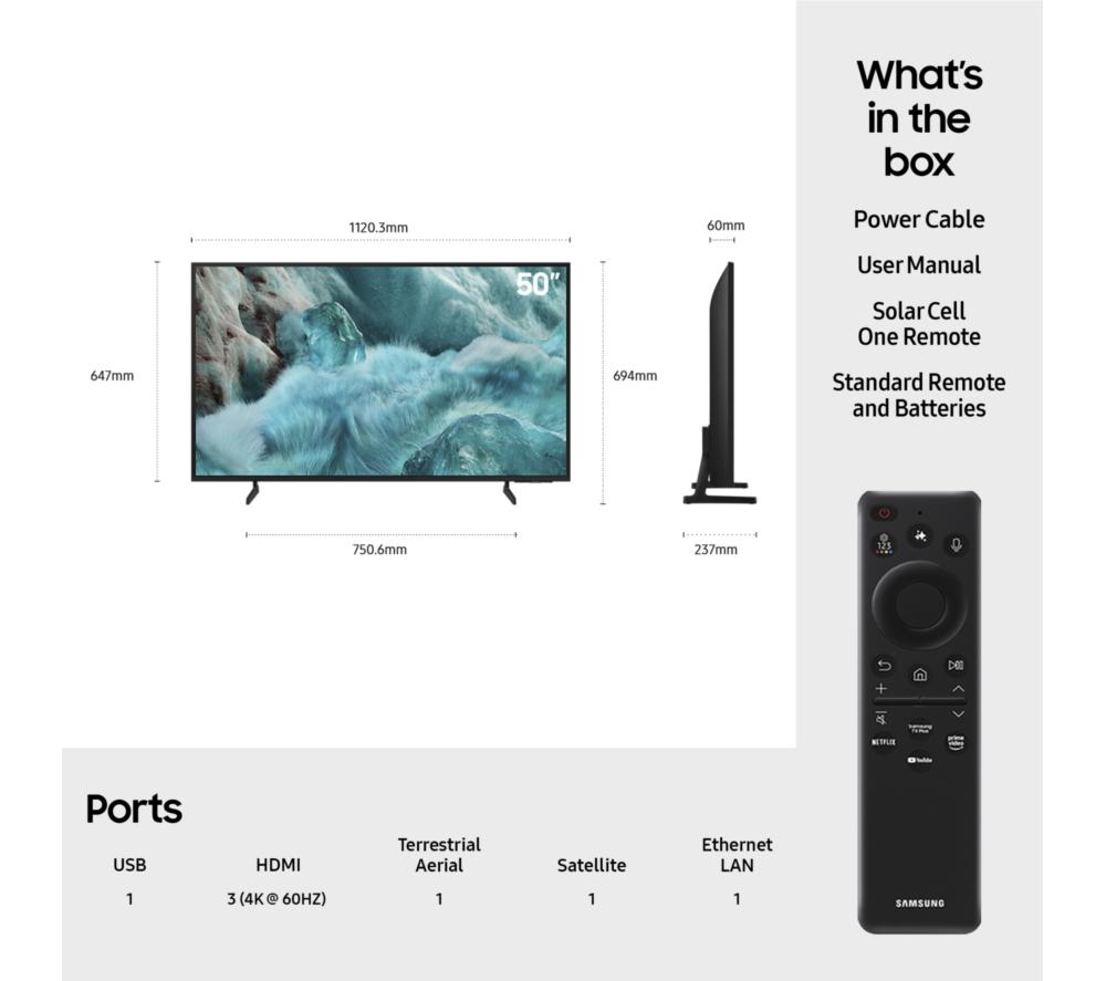 Your content gets the VIP treatment with this Samsung Q7F 50" TV. Quantum Dots transform light into lifelike, accurate colour for natural looking scenes. The sky is brighter, the grass is greener, and the details are clearer. It's even been given the thumbs up by Pantone (and they know a thing or two about colour). The Q4 AI Processor uses AI to intelligently upscale content scene-by-scene for brilliant clarity and colours. Sports, classic movies, and even the nightly news will get an upgrade thanks to 4K Upscaling.Good to know- Sound is more realistic with Object Tracking Sound Lite – the TV speakers follow the on-screen action- With Quantum HDR, you can enjoy natural details and depth, even in the darkest of scenes- You'll find films, TV shows, and all your favourite catch-up apps on Samsung's Tizen OS- Play 1000s of Xbox titles and other games on the Samsung Gaming Hub – no downloads, no console, no fuss- Samsung TV Plus gives you instant access to live TV and 1000s shows and movies, for free__________________________________________Please note: - Samsung Account required to access network-based smart services and apps. If you choose not to log-in, you will only get connection to terrestrial TV (applicable to devices with tuners only) and external devices, e.g. via HDMI.- Some apps & services are only available in the UK. Apps & services may be removed or no longer supported by third party content providers at any time. Some apps & services may not be available at launch and may require a firmware update before becoming available. Some services require an account and/or subscription fee.