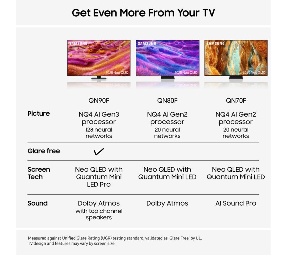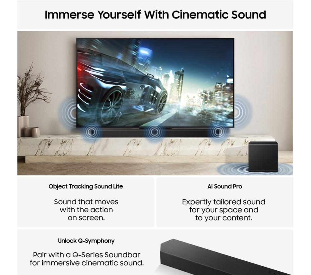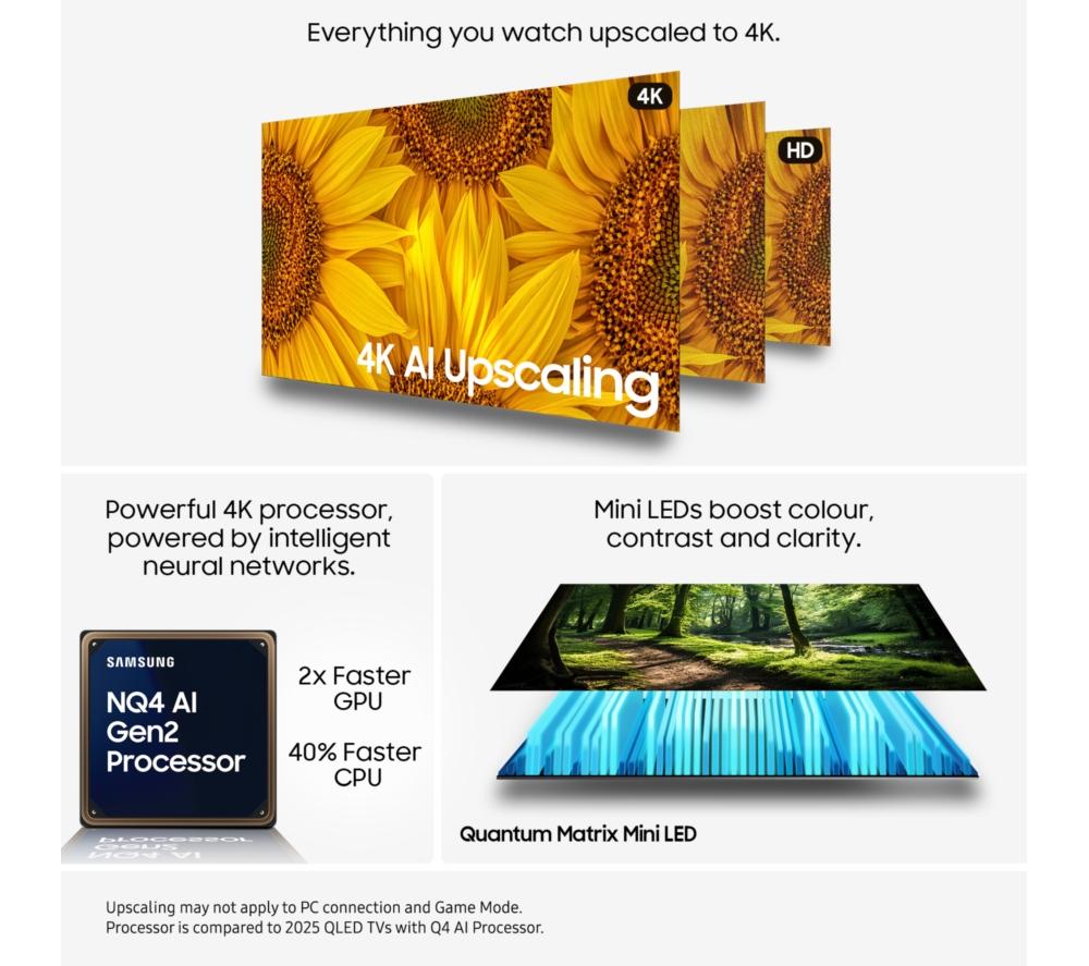 Content gets the VIP treatment with this Samsung QN70F 75" TV. Mini LEDs boost the brightness, colours, and contrast of everything you watch. The NQ4 AI Gen2 Processor is the brain of the TV, working behind the scenes to boost the brightness, colour, resolution and sound. And it's able to do this on the fly using AI and 20 neural networks. Sports, classic movies and even the nightly news will get an upgrade to detailed 4K thanks to AI upscaling. The AirSlim Design is made to look good from any angle - plus, the centre stand fits smaller furniture.Good to know- Enjoy ultra-smooth gameplay with up to 4K 144 Hz motion for lag-free, clear visuals- AI Sound Pro expertly adjusts the audio based on what you're watching, so the speech is as clear as the soundtrack- Scenes come to life with Neo Quantum HDR with rich blacks, bright lights, and deep contrast- Colours are Pantone-validated for accurate, beautiful hues and skin tones- You'll find films, TV shows, and all your favourite catch-up apps on Samsung's Tizen OS- Play 1000s of Xbox titles and other games on the Samsung Gaming Hub – no downloads, no console, no fuss__________________________________________Please note: - Samsung Account required to access network-based smart services and apps. If you choose not to log-in, you will only get connection to terrestrial TV (applicable to devices with tuners only) and external devices, e.g. via HDMI.- Some apps & services are only available in the UK. Apps & services may be removed or no longer supported by third party content providers at any time. Some apps & services may not be available at launch and may require a firmware update before becoming available. Some services require an account and/or subscription fee.