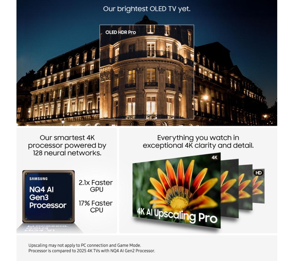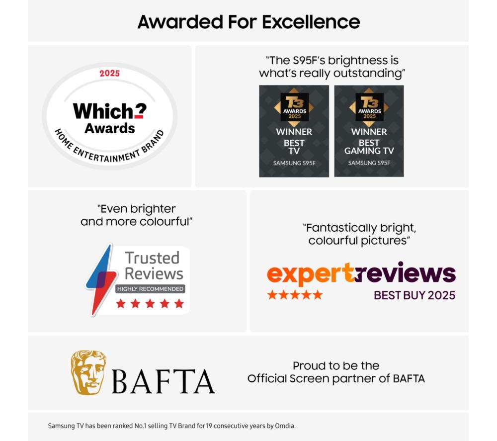 The OLED display on this Samsung S95F 65" TV brings a bit of cinema magic to your living room. Because the pixels are self-lit, the TV can accurately control the shadows and highlights. Everything looks much more real with deep blacks and billions of colours that burst from the screen. The NQ4 AI Gen3 Processor creates Samsung's best 4K experience - it's the brain of the TV, working behind the scenes to boost the brightness, colour, resolution and sound. And it's able to do this on the fly using AI and 128 neural networks. Sports, classic movies, and even the nightly news will get an upgrade to stunning 4K thanks to AI Upscaling Pro. And Glare Free technology keeps annoying reflections to a minimum – no need to shut the curtains or dim the lights each time.Good to know- OLED HDR Pro gives you brilliantly bright highlights and super rich blacks for more detail in every scene- This TV looks stunning edge-to-edge with the Infinity One design- You can clear the clutter by plugging in your consoles and boxes into the One Connect box – it connects with a single cable to your TV- Dolby Atmos uses the TV's speakers to create an immersive surround sound effect – you'll love how incredible everything sounds- AI Motion Enhancer Pro turns fast-action blur into super smooth movement, so you won't miss a thing- Sound is more realistic with Object Tracking Sound+ and eight dedicated speakers firing from all sides of the screen- Enjoy ultra-smooth 8K gameplay with up to 4K 165 Hz and 8K 120 Hz motion for lag-free, clear visuals__________________________________________Please note: - Samsung Account required to access network-based smart services and apps. If you choose not to log-in, you will only get connection to terrestrial TV (applicable to devices with tuners only) and external devices, e.g. via HDMI.- Some apps & services are only available in the UK. Apps & services may be removed or no longer supported by third party content providers at any time. Some apps & services may not be available at launch and may require a firmware update before becoming available. Some services require an account and/or subscription fee.