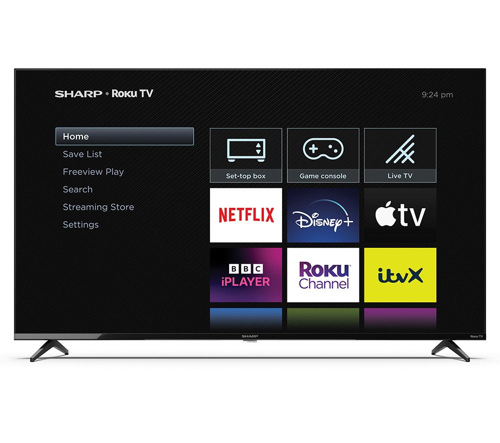 Smart TV is made easy on this Sharp Roku TV. You'll find all your favourite streaming apps like Netflix, Amazon Prime, and Disney+. The simple home screen and easy-to-use remote means you can jump straight into your TV shows and movies. And it all looks great on the 4K Ultra HD screen. Even older entertainment gets an update with image upscaler technology. Plus, Dolby Vision content looks epic with deep blacks, bright lights and true-to-life colours.Good to know- With Active Motion 400, even fast-moving objects stay in focus – perfect for sports and action movies- Pair it with a compatible sound bar to make the most of Dolby Digital and Dolby Digital+ sound- Catch-up straight from the TV guide with Freeview Play________________________________Please note: Some apps & services (including tuner) are only available in the UK. Apps & services may be removed or no longer supported by third party content providers at any time. Some apps & services may not be available at launch and may require a firmware update before becoming available. Some services require an account and/or subscription fee.