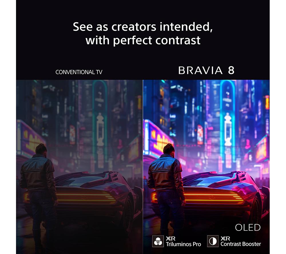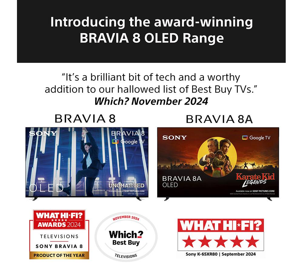 Everything looks bright and beautiful on the Sony BRAVIA 8 TV's OLED screen. A canvas of over 8 million self-lit pixels, it paints every scene with deep blacks and lively colours. The XR Contrast Booster balances light and dark to show you every scene just right, so you won't miss a thing. And with XR Triluminous Pro replicating over a billion colours with incredible accuracy, it's a real feast for the eyes. Sony have teamed up with some of the world's top streaming studios to develop calibrated modes for the likes of Netflix and Prime Video. You'll be able to enjoy movies just as the creators intended, without playing around in the settings menu. Plus, sound is in perfect sync with Acoustic Surface Audio+. It turns the screen into a speaker – literally – with sound coming from where the action is happening. Even in a hectic battle scene, you'll be able to pinpoint the clash of swords.Good to know- The XR Processor intelligently analyses and recognises what's on the screen for better realism- Dolby Atmos creates a virtual surround sound experience without the need for extra speakers- Blockbuster movies look oh-so-good with support for IMAX Enhanced and Dolby Vision- Booming explosions but whisper-quiet voices? Voice Zoom 3 makes it easy to hear what they're saying- The 4-way multi-position stand can be adjusted to suit your furniture and soundbar- Check your power usage and make positive changes in the Eco Dashboard 2 – the Eco Remote is rechargeable too- Jump straight into your shows or discover something new on Google TV with Google Assistant- The Sony Pictures Core app has tons of movies, plus you can redeem 10 for free (within 24 months)- It's packed with gaming tech like 4K/120 fps, VRR, ALLM – you can easily access everything in the Game Menu 2