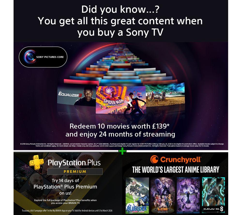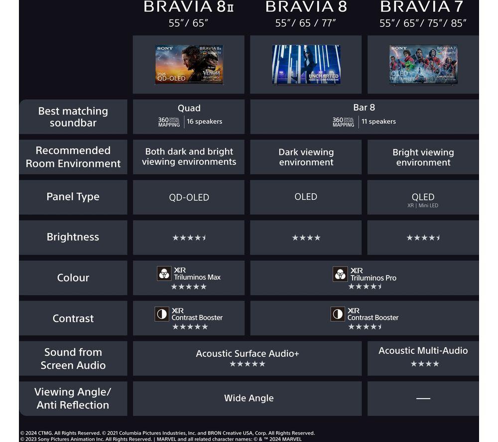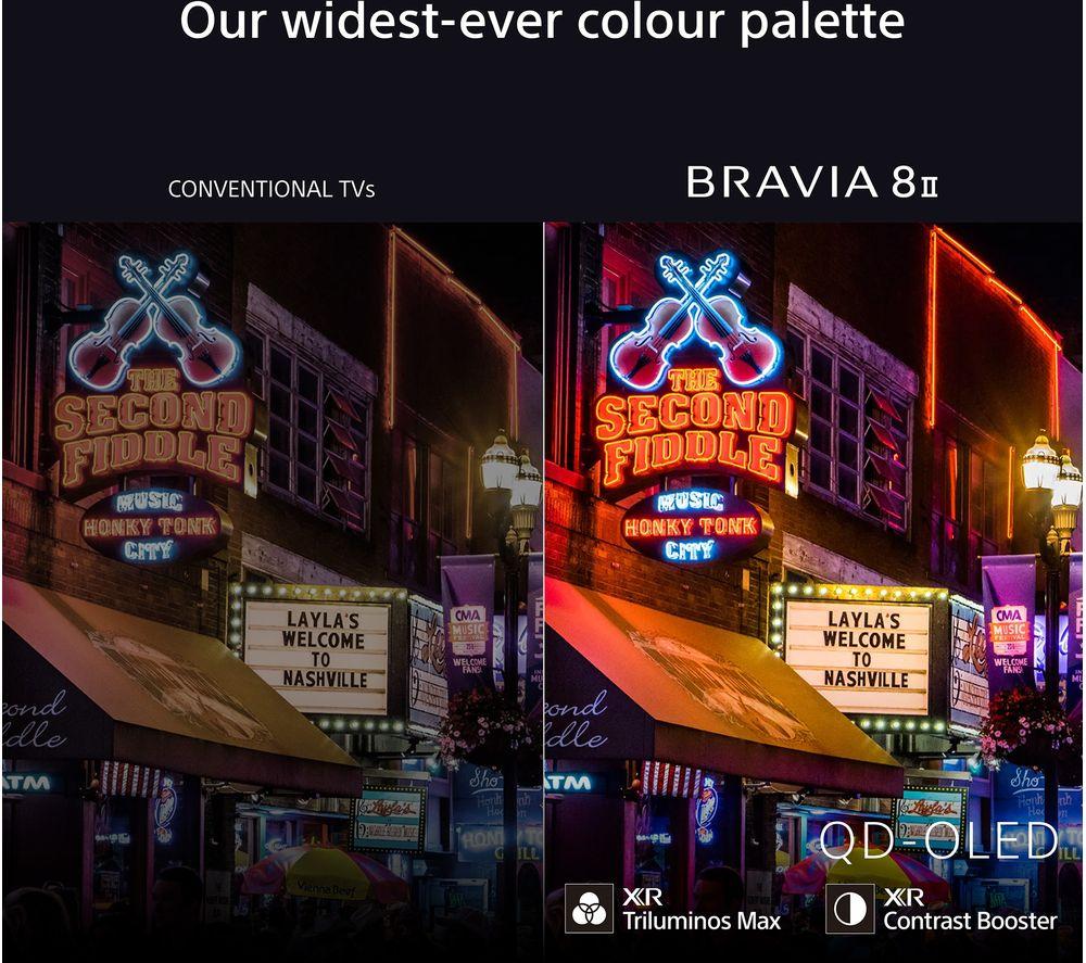 Enjoy a cinematic experience with the Sony BRAVIA 8 II 55" TV. The QD-OLED screen paints every scene with deep blacks and vivid colours. XR Triluminous Max displays a wide range of colours with incredible accuracy, so it's a real feast for the eyes. The XR AI Processor intelligently analyses and recognises what's on the screen for better realism. Plus, sound is in perfect sync with Acoustic Surface Audio+. It turns the screen into a speaker – literally – with sound coming from where the action is happening. Good to know - Acoustic Centre Sync turns the TV into a centre speaker when paired with Sony sound bars- Enjoy immersive surround sound with Dolby Atmos and DTS:X technology- Blockbuster movies look oh-so-good with support for IMAX Enhanced and Dolby Vision- Enjoy expertly calibrated movies on Sony Pictures Core that are true to the creator's vision- Google TV gives you access to over 40,000 movies and TV shows and over 10,000 apps and games- It's packed with gaming tech like 4K/120 fps, VRR, ALLM and you can easily access everything in the Game Menu 2________________________________Please note: Some apps & services (including tuner) are only available in the UK. Apps & services may be removed or no longer supported by third party content providers at any time. Some apps & services may not be available at launch and may require a firmware update before becoming available. Some services require an account and/or subscription fee.
