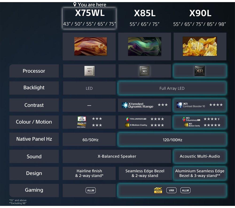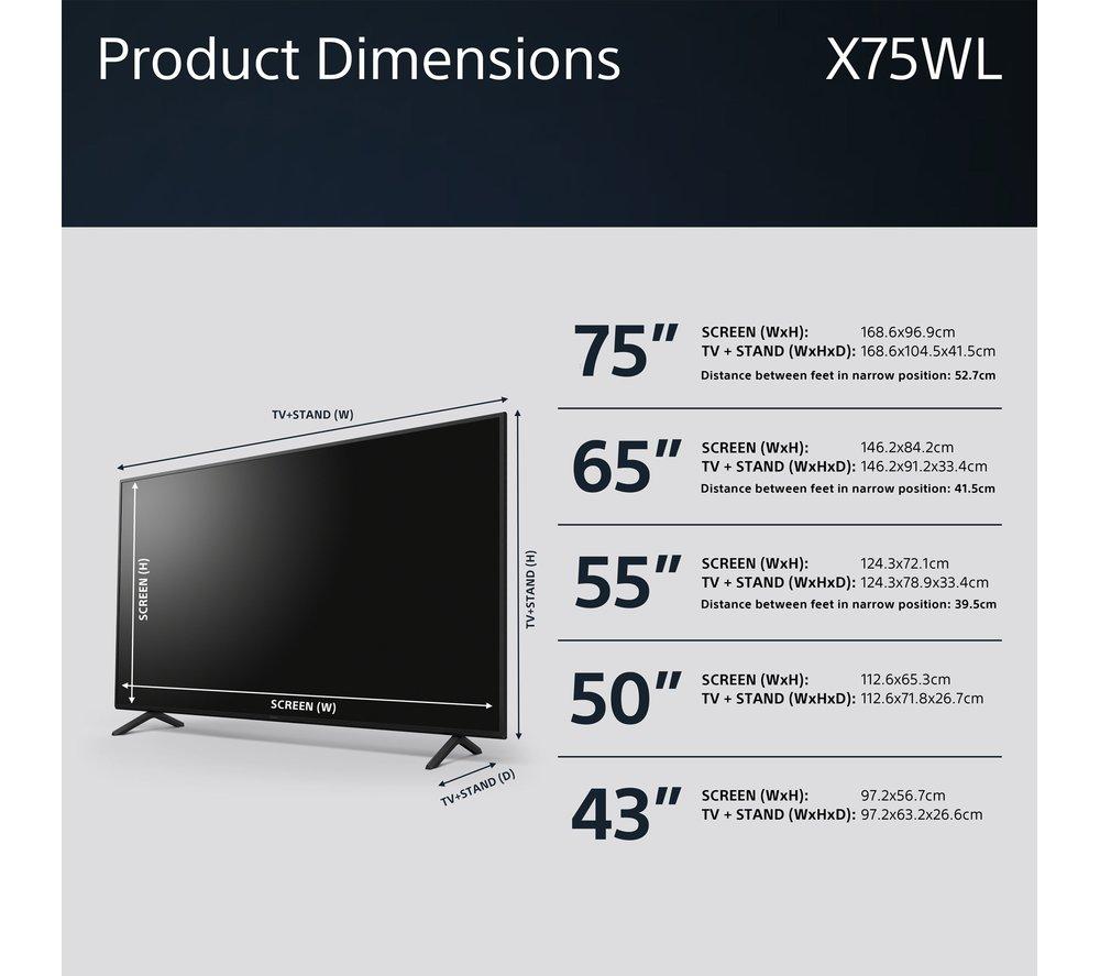 Life's better when it's full of colour. This Sony X75WL's 4K HDR display brings billions of vivid colours to every scene - the sky is bluer, the sun is brighter, and the grass really is greener. The brain behind the operation is the 4K Processor X1. It analyses content in real time, which means you see more detail and texture. With Motionflow XR technology, even fast-moving objects stay perfectly in focus, so you'll have no trouble keeping up with the action. And Dolby Atmos uses the TV's speakers to create virtual surround sound, so you can bask in the roar of the crowd on cup final day.Good to know- 4K X-Reality PRO technology upscales older movies into 4K – your vintage movie marathon just got more epic- You'll be able to see even the smallest of details in high-contrast scenes thanks to Auto HDR Tone Mapping- Hook up your games console and the TV switches to Auto Low-Latency mode for smooth, responsive gameplay- Its minimalistic design looks great mounted on the wall or a TV cabinet with the slim blade fixed stand- Google TV makes it easy to find 700,000+ TV shows and movies across your favourite streaming services- A light sensor adjusts the TVs brightness based on the ambient brightness of your room – perfect for those romantic nights in________________________________Please note: Some apps & services (including tuner) are only available in the UK. Apps & services may be removed or no longer supported by third party content providers at any time. Some apps & services may not be available at launch and may require a firmware update before becoming available. Some services require an account and/or subscription fee.