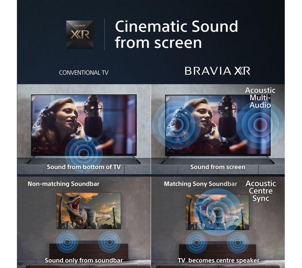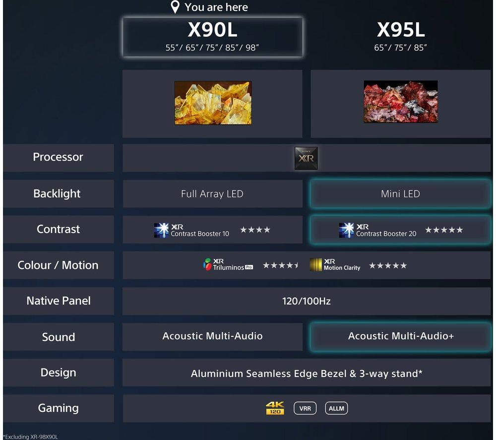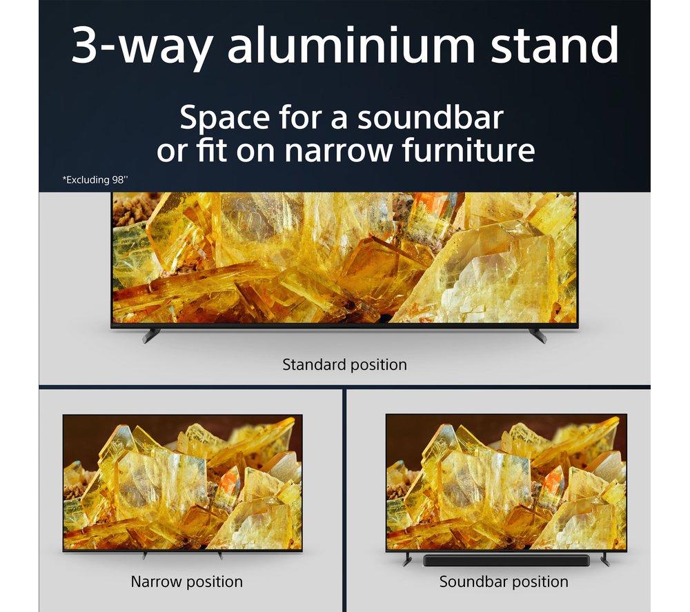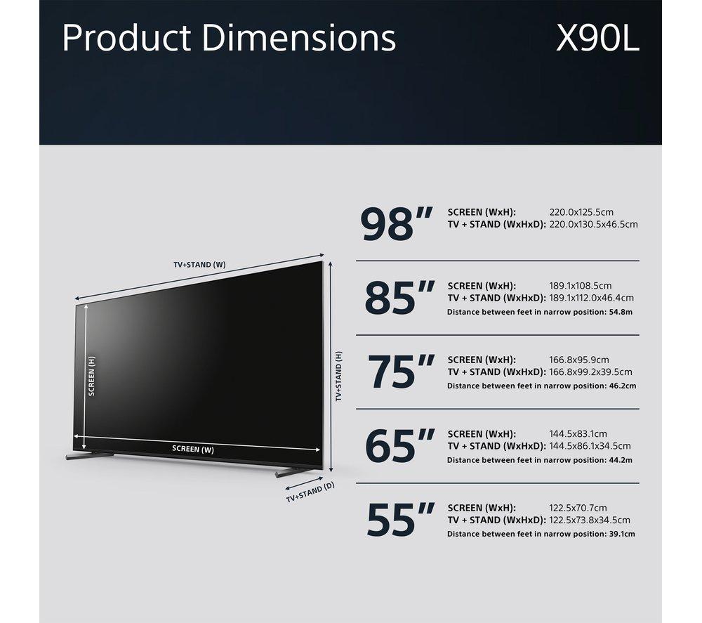 Get the stadium experience in your front room with this Sony X90L. Its 4K Full Array LED display brings dazzling brightness and billions of vivid colours to every scene by squeezing more LEDs into the entire screen. The brain behind the operation is the Cognitive Processor XR. It analyses content and controls each zone in real time, so you see more real-world detail and texture. With XR-Motion Clarity technology, even fast-moving objects stay perfectly in focus, so you'll have no trouble keeping up with the action. And with Acoustic Multi Audio+ technology, sound appears to come at you from where it's happening on the screen - the roar of the crowd never sounded so good.Good to know- 4K X-Reality PRO technology upscales older movies into 4K – your vintage movie marathon just got more epic- You'll be able to see even the smallest of details in high-contrast scenes thanks to Auto HDR Tone Mapping- Dolby Atmos uses the TV's speakers to create virtual surround sound for that movie theatre experience- With a 100 Hz refresh rate, gaming is silky smooth with no stuttering or screen tearing – the competition doesn't stand a chance- The 3-way aluminium edge stand can be adjusted to fit the size of your furniture and soundbar- Its seamless edge bezel keeps your eyes fixed on the screen, so you won't miss a single detail- Google TV makes it easy to find 700,000+ TV shows and movies across your favourite streaming services________________________________Please note: Some apps & services (including tuner) are only available in the UK. Apps & services may be removed or no longer supported by third party content providers at any time. Some apps & services may not be available at launch and may require a firmware update before becoming available. Some services require an account and/or subscription fee.