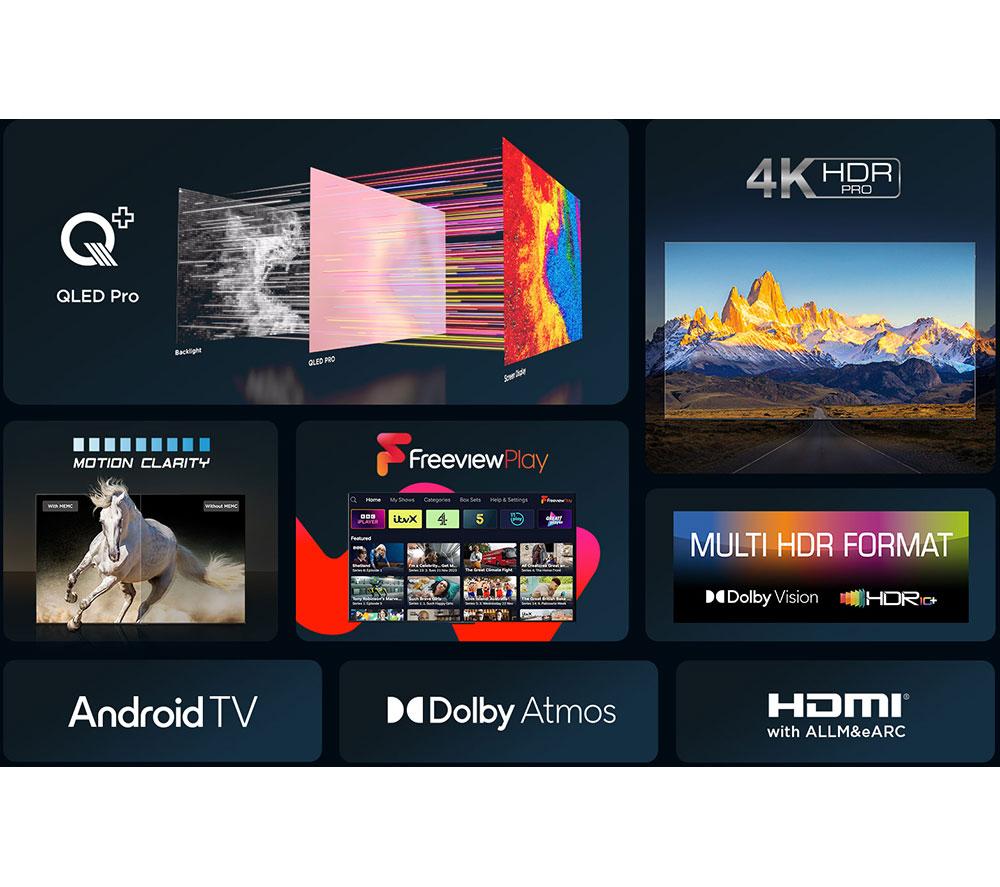 You'll find that the grass truly is greener on this TCL C655K TV. The QLED PRO panel can display a billion different colours and shades, so you can appreciate your team's new kit in all its glory. The brain of the TV is the AiPQ processor. It uses AI to observe what's on the screen and ramp up the colours, contrast, and clarity for the best and most accurate experience. Plus, this telly supports popular HDR tech, including Dolby Vision and HDR10+. The colour and contrast is given a boost, so each scene has more depth and detail.Good to know- Motion Clarity makes fast-paced movement smoother, so you can keep up with the action- Get swept up in the drama with Dolby Atmos creating a surround sound experience- Get gaming with support for HDMI 2.1 and low latency mode - plus a handy Game Bar for settings- Find your favourites and discover new content on Android TV or mirror your screen with Chromecast- Control the TV using your voice with Google Assistant or Amazon Alexa- Catch up on shows straight from the TV guide with Freeview Play________________________________Please note: Some apps & services (including tuner) are only available in the UK. Apps & services may be removed or no longer supported by third party content providers at any time. Some apps & services may not be available at launch and may require a firmware update before becoming available.
