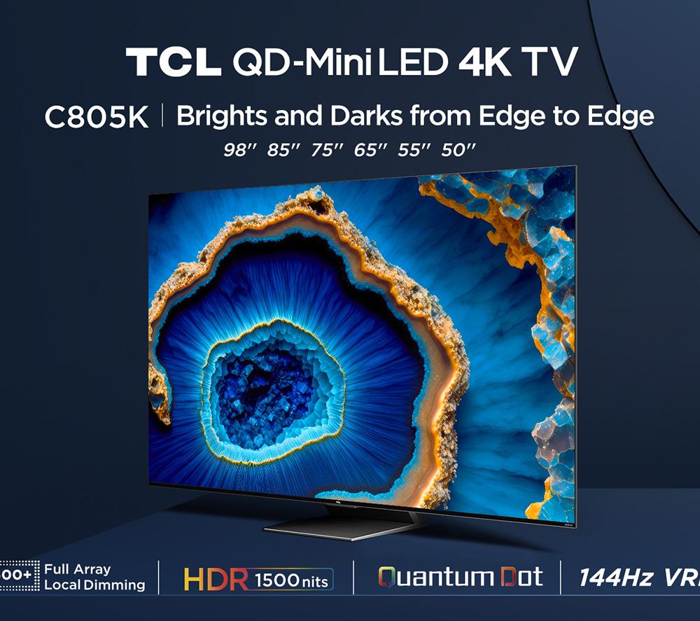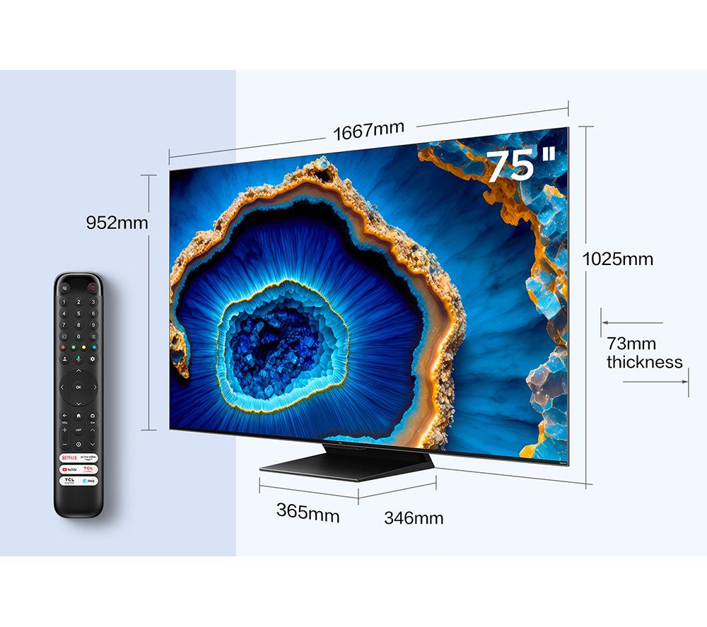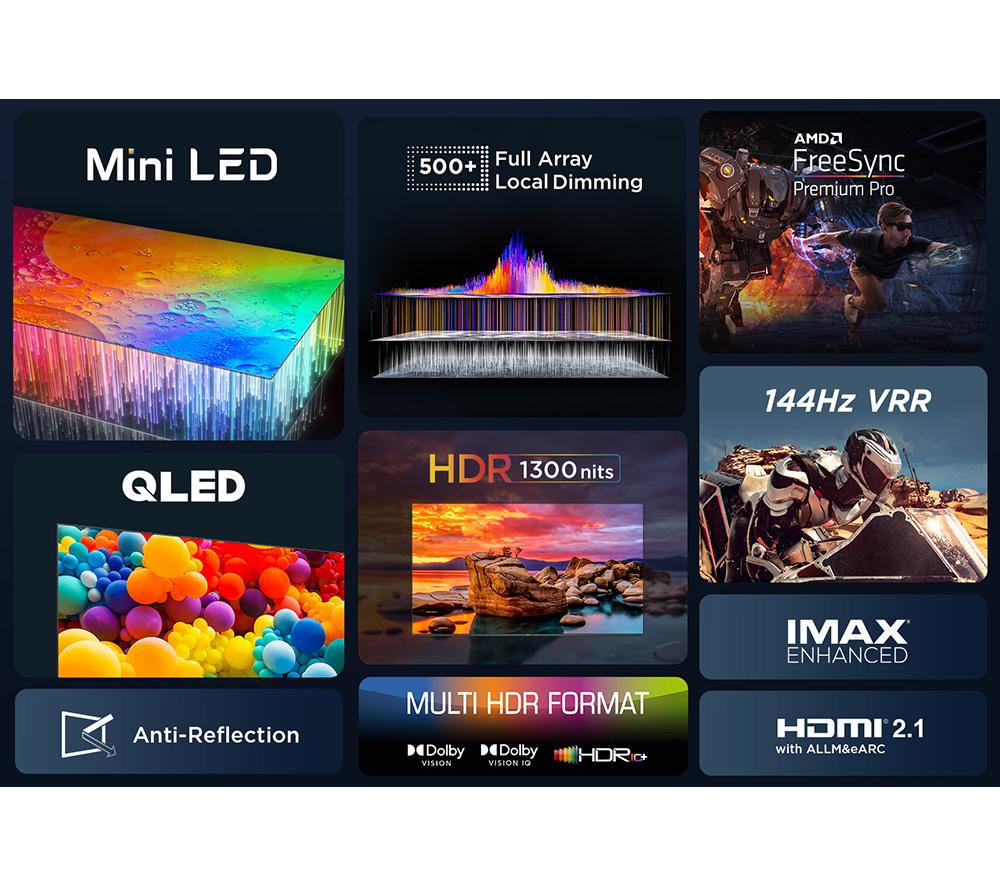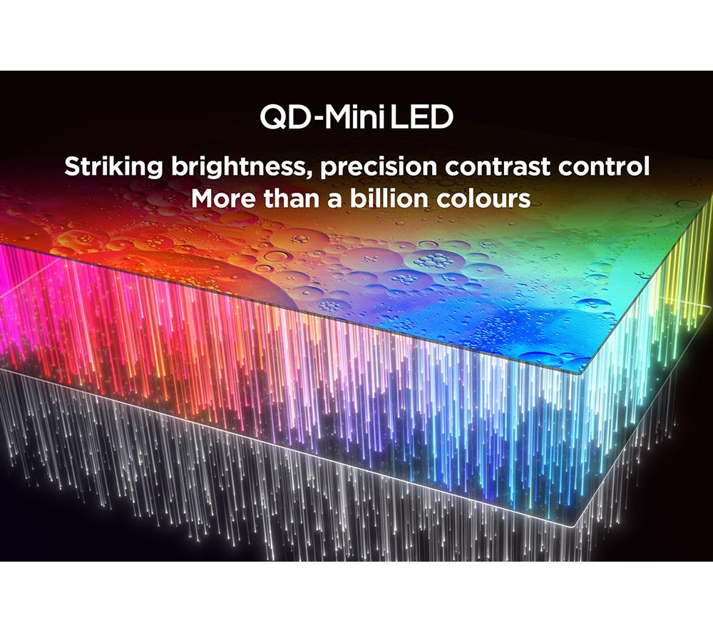 This TCL C805K TV uses an army of Mini LEDs to fine-tune the highlights and shadows from edge to edge. Smaller than a standard LED, each one is precisely controlled for some seriously sharp contrast. Over 800 local dimming zones make sure every pixel is on point, so you'll see just what's lurking in the shadows. It's like a festival of colours with Quantum Dots bringing every scene to life. And with HDR 1500 amping up the contrast and colours in a realistic way, movies and shows will be closer to the director's vision. The cherry on top has to be Dolby Atmos. It wraps you in 3D sound that feels so real, you might just duck when that chopper zooms by.Good to know- You're in for a smooth ride with 144 Hz Motion Clarity PRO's ability to show fast-paced action without any juddering- It supports popular HDR formats like Dolby Vision and HDR10+, so you're covered for most streaming services- Game Master Pro 2.0 brings you pro-level gaming features to give you the edge in every battle- Google TV is your entertainment hub and smart home remote all rolled into one – it's kid-friendly too________________________________Please note: Some apps & services (including tuner) are only available in the UK. Apps & services may be removed or no longer supported by third party content providers at any time. Some apps & services may not be available at launch and may require a firmware update before becoming available.