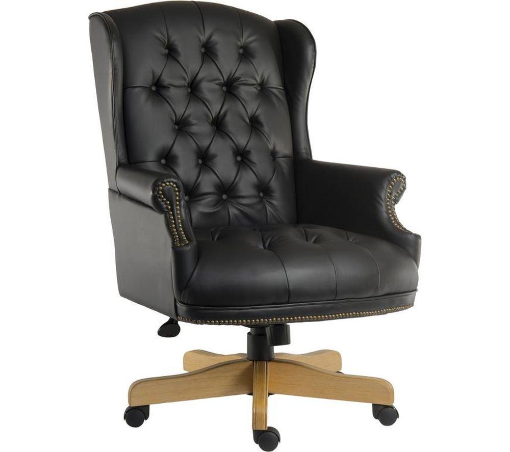 Make important decisions in comfort and style with the Teknik Chairman Noir Bonded-leather Tilting Executive Chair.The button-tufted upholstery and nail-head trim will bring a traditional look to your office.Find the right position with the adjustable height and tilt. This swivel chair also has padded wing armrests for added comfort.