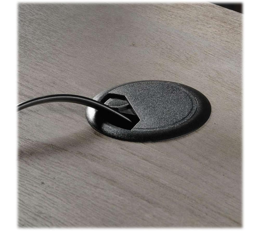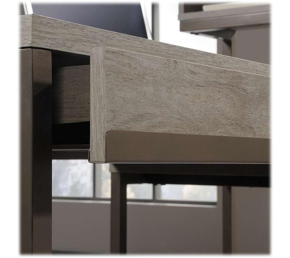 The Teknik Manhattan View L-Shaped Desk offers a sturdy metal frame with laminated particle board and mystic oak finish to give your office a rugged, natural look.Want to have storage space within reach? The Manhattan View Desk has a drawer with a flip-down panel and elevated shelving, so you can easily find what you're looking for.The desk also offers discreet cable management so you can keep your work area free of annoying cables.