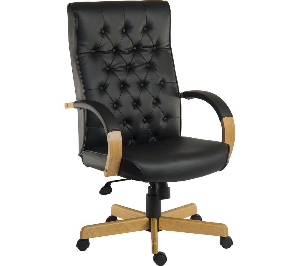 Create a traditional luxurious look in your office space with the Teknik Warwick Leather Reclining Executive Chair, which gives you that well-deserved comfort when you're working.The shiny black bonded leather material with matching arm rest is easy to wipe clean (perfect for coffee spills) and blends perfectly with the sand coloured wooden accents.Thanks to the gas-lift height adjustment, tilt tension and reclining function you can adjust it as you prefer and snugly get in to that position you want.