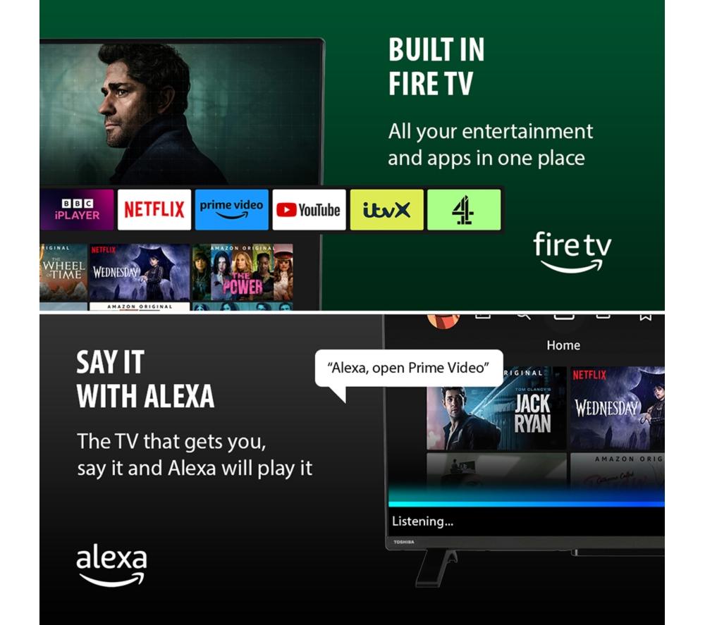 Forget endless scrolling, Fire TV on this Toshiba LED TV brings your recommendations, favourites, and currently watching together in one place. Each family member can have their own profile, so you can keep your shows separate from your kid's favourites. You'll really see the difference when watching HDR content - it displays a wider range of colours with enhanced contrast. And you can enjoy darker blacks and brighter whites across the whole screen thanks to Micro Dimming - you'll see more detail in every scene.Good to know- Tru Resolution upscales older content into HD, so those classic movies will look better than ever - Control your TV using your just voice – just use the Alexa voice remote - Freeview Play makes it easy to catch up on episodes you've missed from the past week – all on demand and in one place ________________________________ Please note: Some apps & services (including tuner) are only available in the UK. Apps & services may be removed or no longer supported by third party content providers at any time. Some apps & services may not be available at launch and may require a firmware update before becoming available. Some services require an account and/or subscription fee.