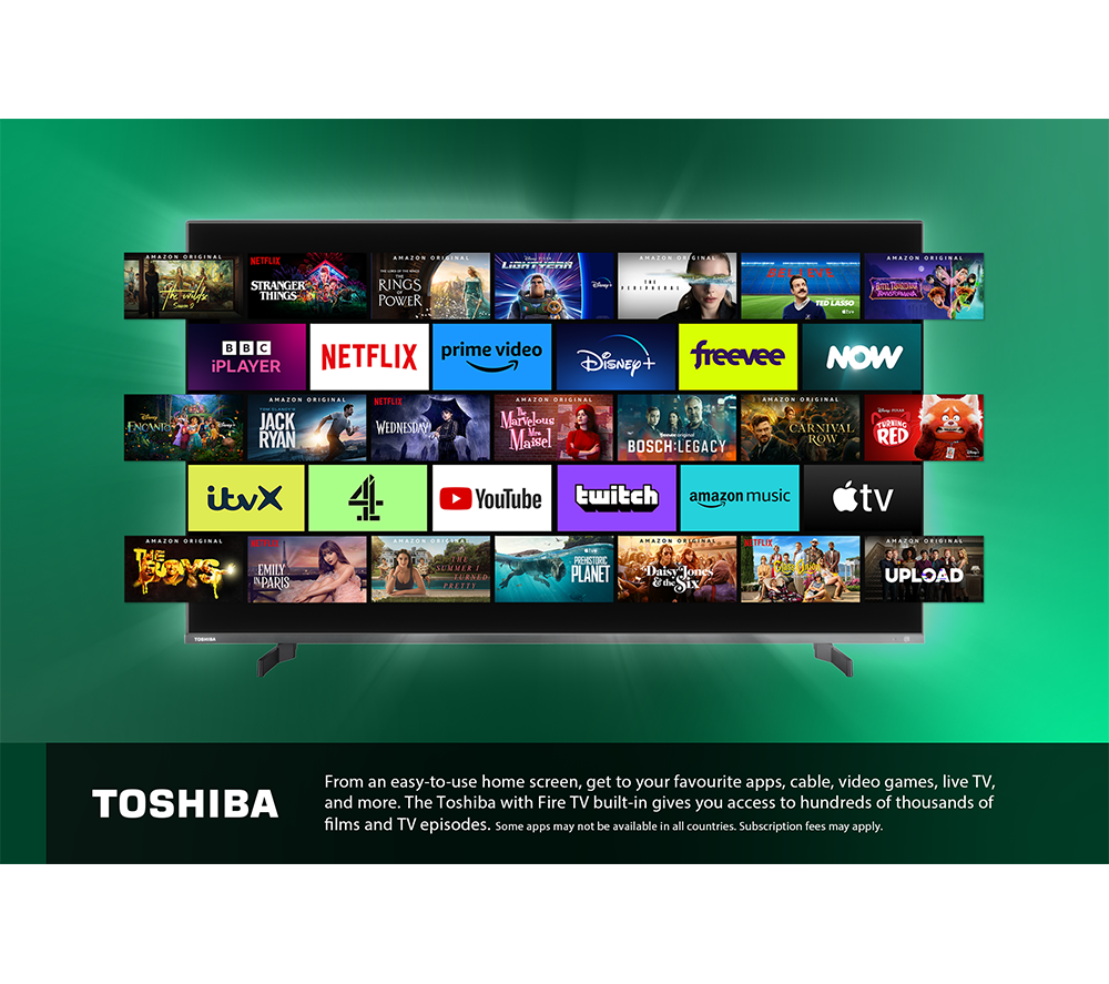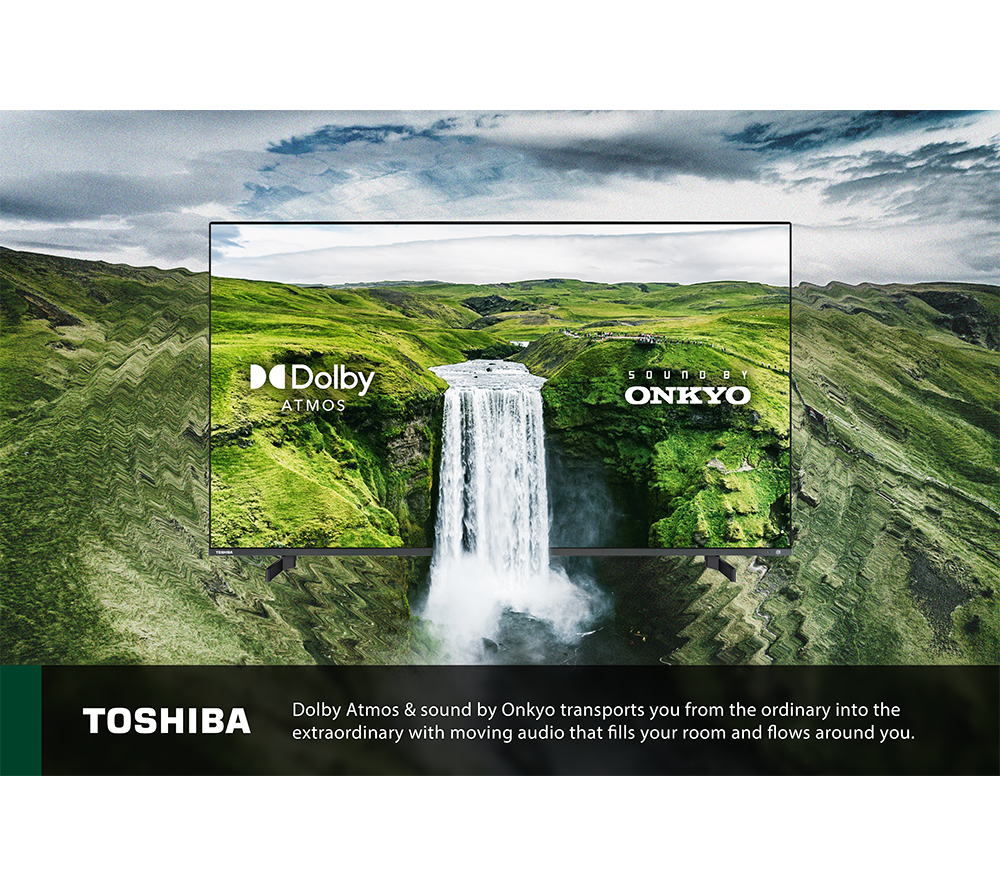 It's not easy to imagine one billion shades of colour, but with Quantum Dot technology on this Toshiba 4K QLED TV, you won't have to. Everything you watch feels vibrant, even in a brightly lit room. And then there's Toshiba's TRU Picture Engine. It's busy behind the scenes boosting the contrast and resolution while smoothing out fast-paced action. Even non-4K content gets a upgrade. To get the most out of the 4K HDR screen, you'll find all the apps you love on Fire TV. The homepage brings together your recommendations and currently watching so you can get stuck straight in. Plus, each family member can have their own profile, so you can keep your shows separate from your kid's favourites.Good to know- To make the most of those film scores, Dolby Atmos creates a room-filling 3D surround sound effect- Even non-Atmos content sounds great with the Onkyo speakers and built-in sub- You'll see a wider range of colours and improved contrast on Dolby Vision content- Use the Alexa voice remote to search or control your smart home- Freeview Play makes it easy to catch up on episodes you've missed from the past week – all on demand and in one place________________________________Please note: Some apps & services (including tuner) are only available in the UK. Apps & services may be removed or no longer supported by third-party content providers at any time. Some apps & services may not be available at launch and may require a firmware update before becoming available. Some services require an account and/or subscription fee.